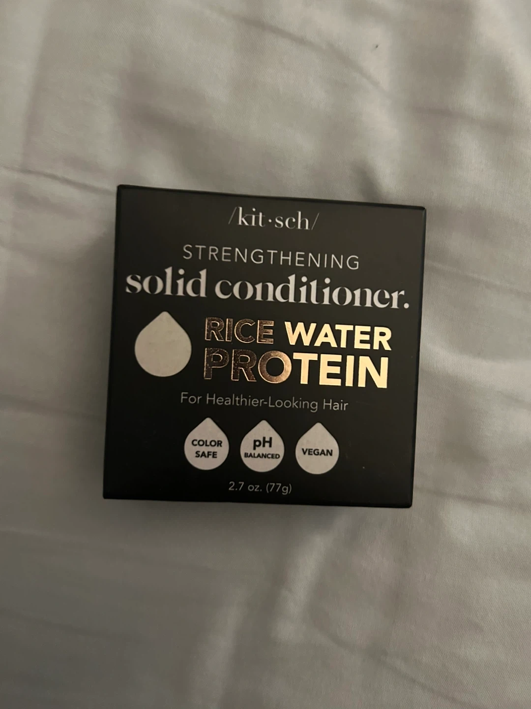 I'm selling a Kitsch Strengthening Solid Conditioner, Rice Water Protein. It's for healthier-looking hair and is colour safe and vegan. It's also free of parabens, phthalates, silicones, sulfates and artificial fragrances.