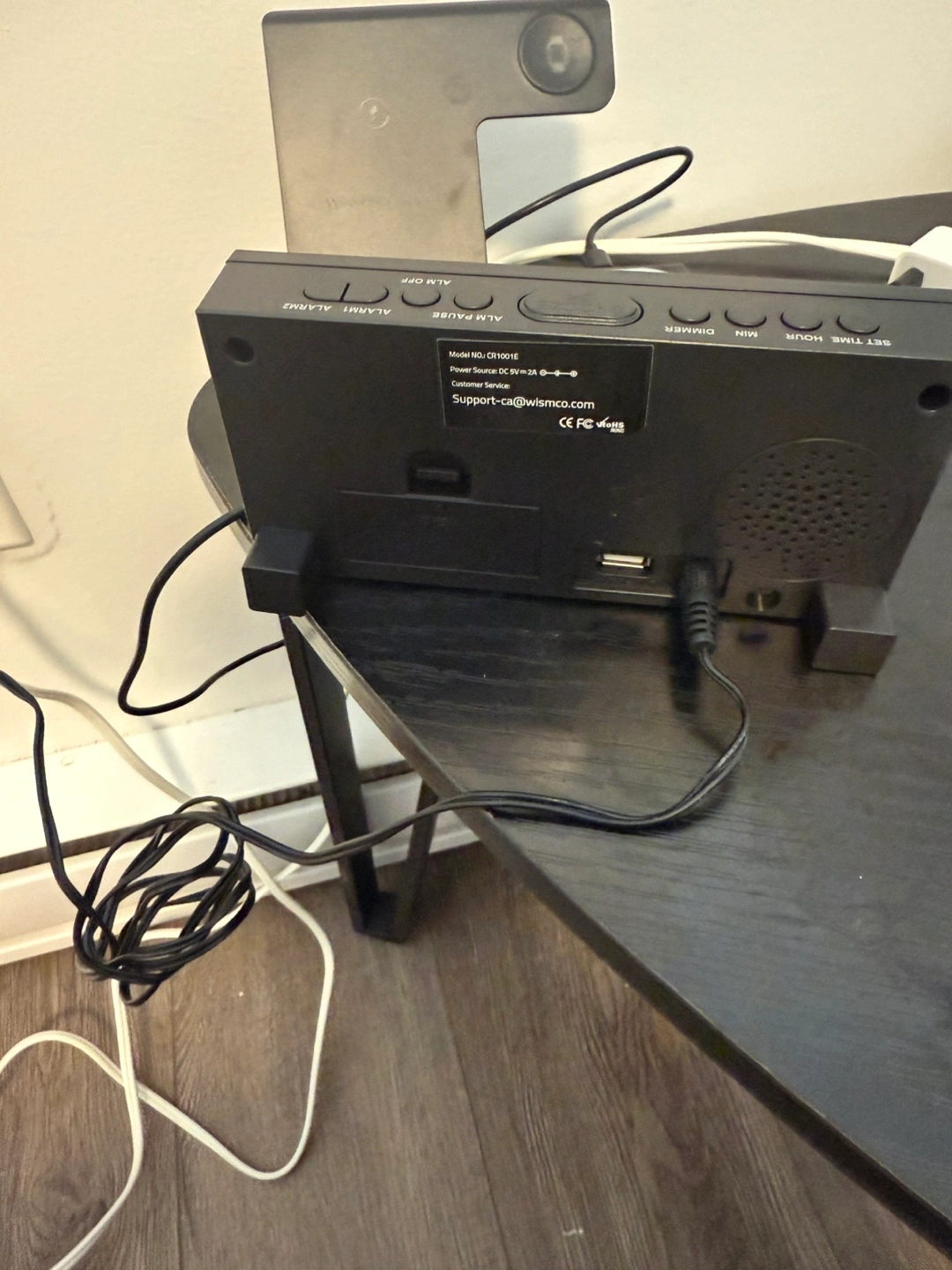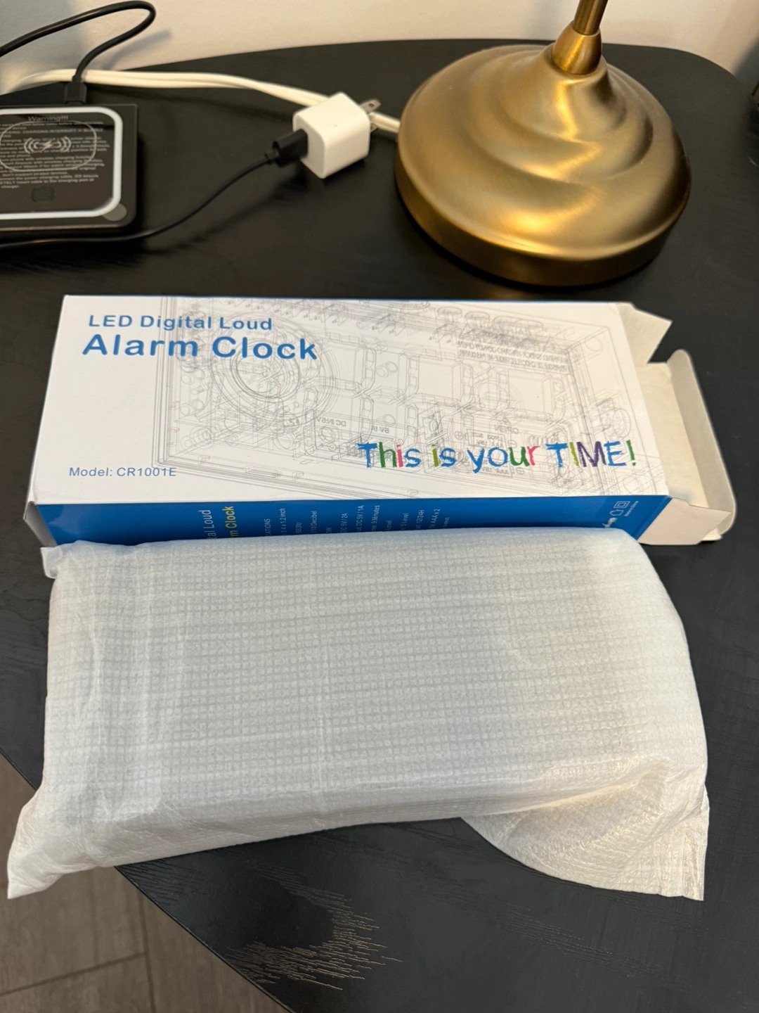 Large LED digital display. AC powered plug-in clock. Features dual alarms, dimmer, and hour/minute setting buttons. Includes stand. Model CR100TE.