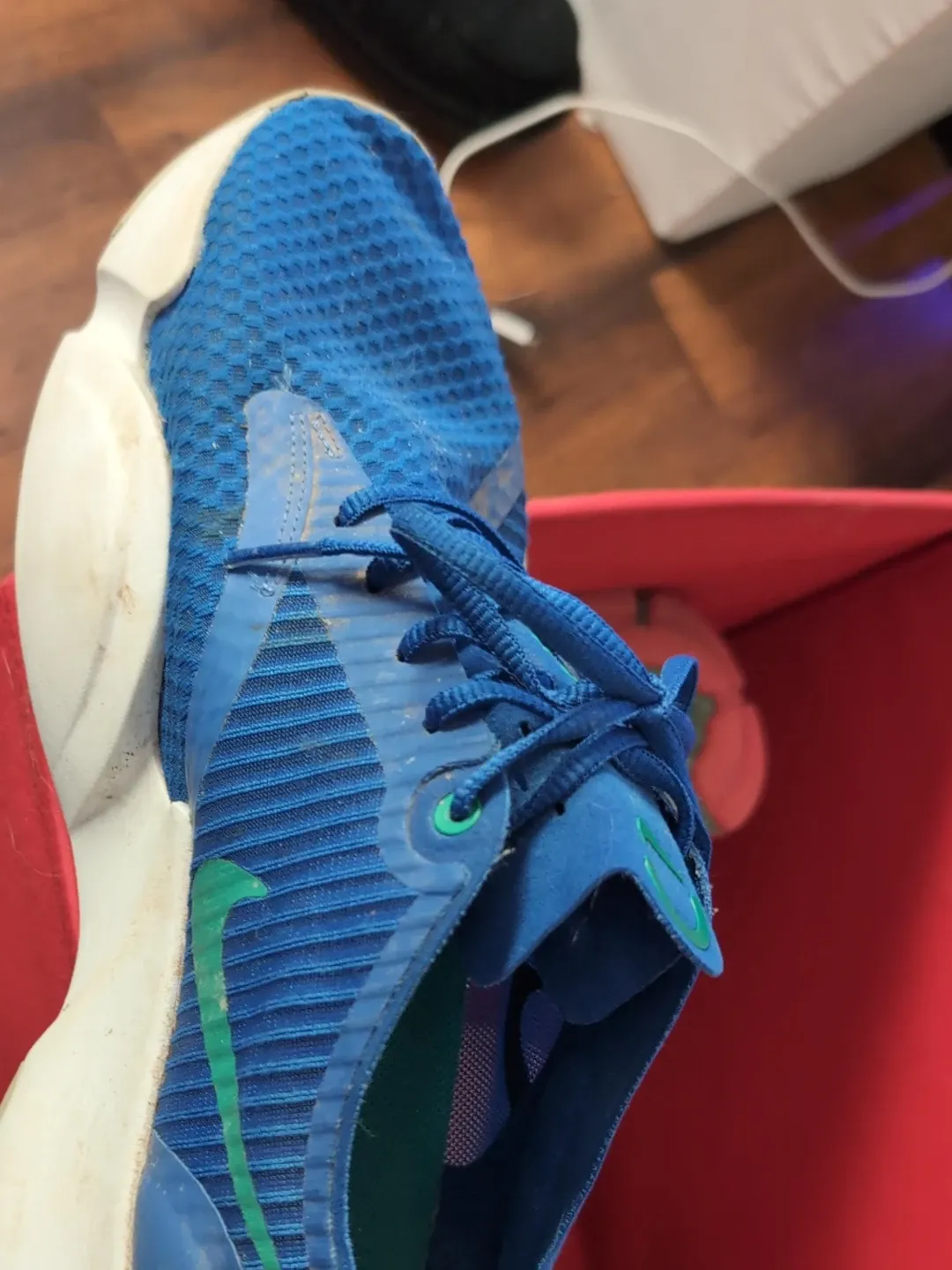 These are blue Nike running shoes. They're a mesh material with a rubber sole. Good for track or road running.