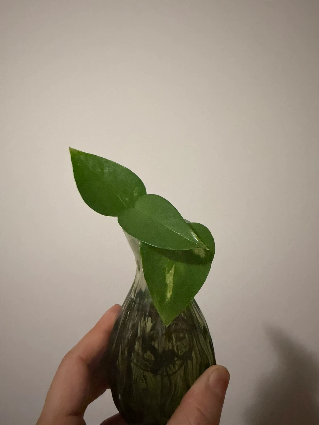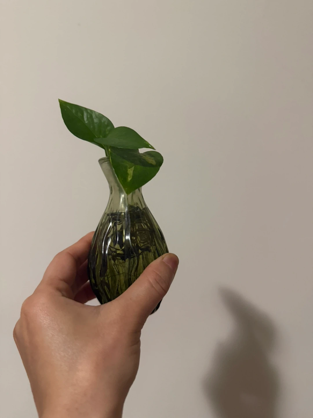 Pothos plant cutting growing roots in a small decorative glass vase. It's a lovely way to start new plants. This cutting is ready to be potted or kept in water!