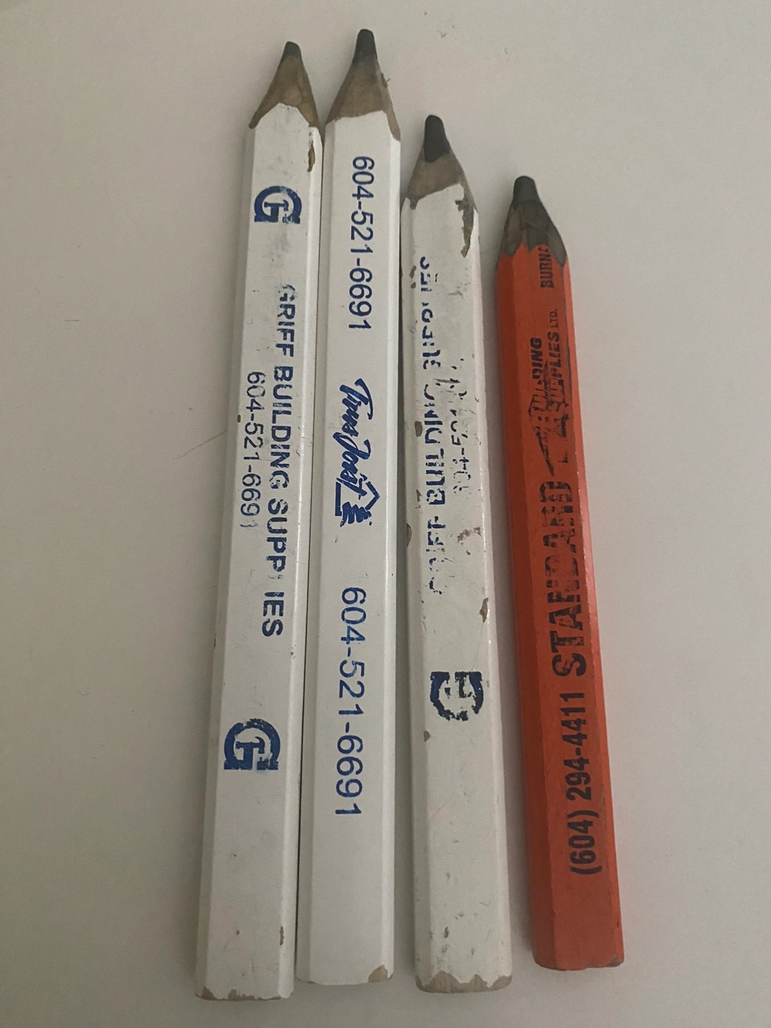 Selling a set of used pencils from various building suppliers: Griff Building Supplies, True Joint, and Standard. Great for marking and measuring on job sites! They show signs of wear but are still perfectly functional for any construction or DIY projects