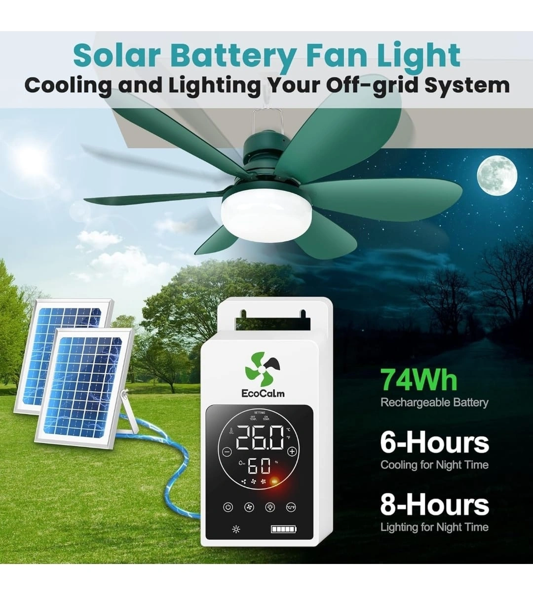 Get ready for summer with this EcoCalm solar battery fan light! It's perfect for cooling and lighting your off-grid system.