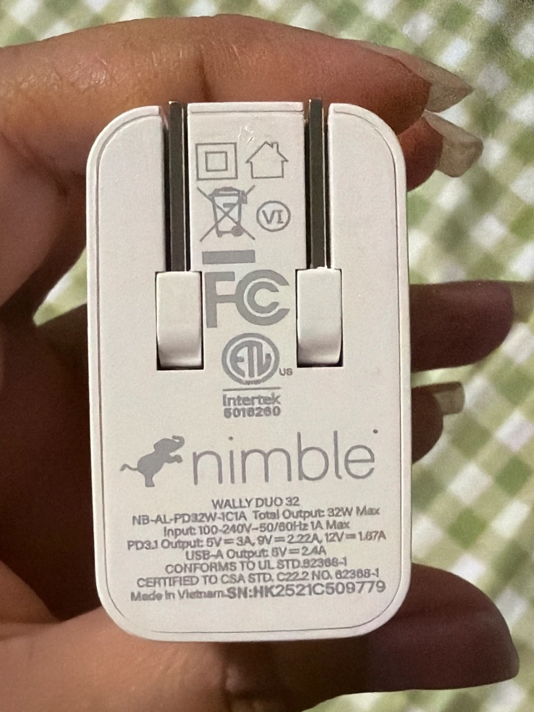 Nimble WALLY DUO 32 wall charger with USB-C and USB-A ports. It offers 32W total output, with 20W max from USB-C and 12W max from USB-A. This charger is made in Vietnam.