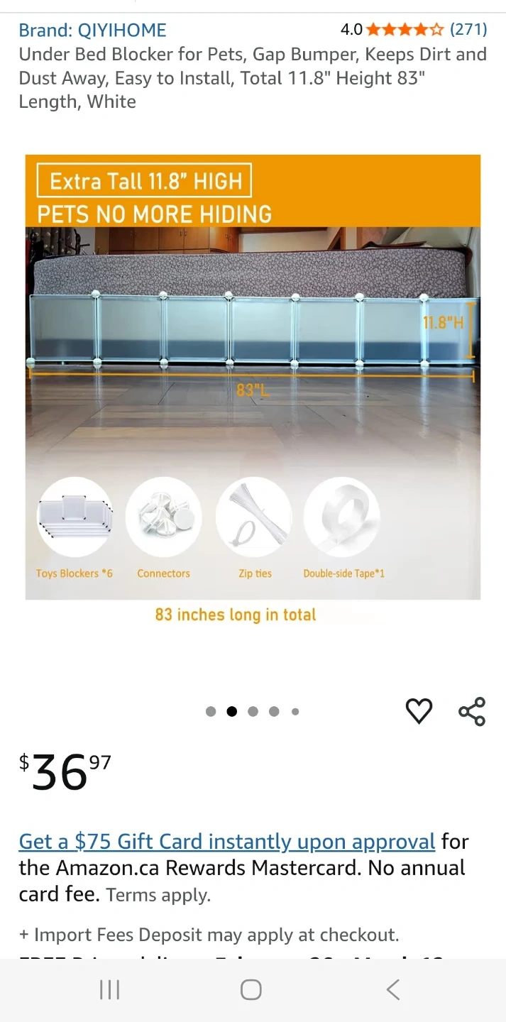 This Qiyihome Under Bed Blocker is designed to keep pets and items from going under furniture. It's made with alloy steel frames and environmental resin panels for durability. Installation is easy and it's waterproof for simple care. Covers one side of a twin, full, queen, or king bed.