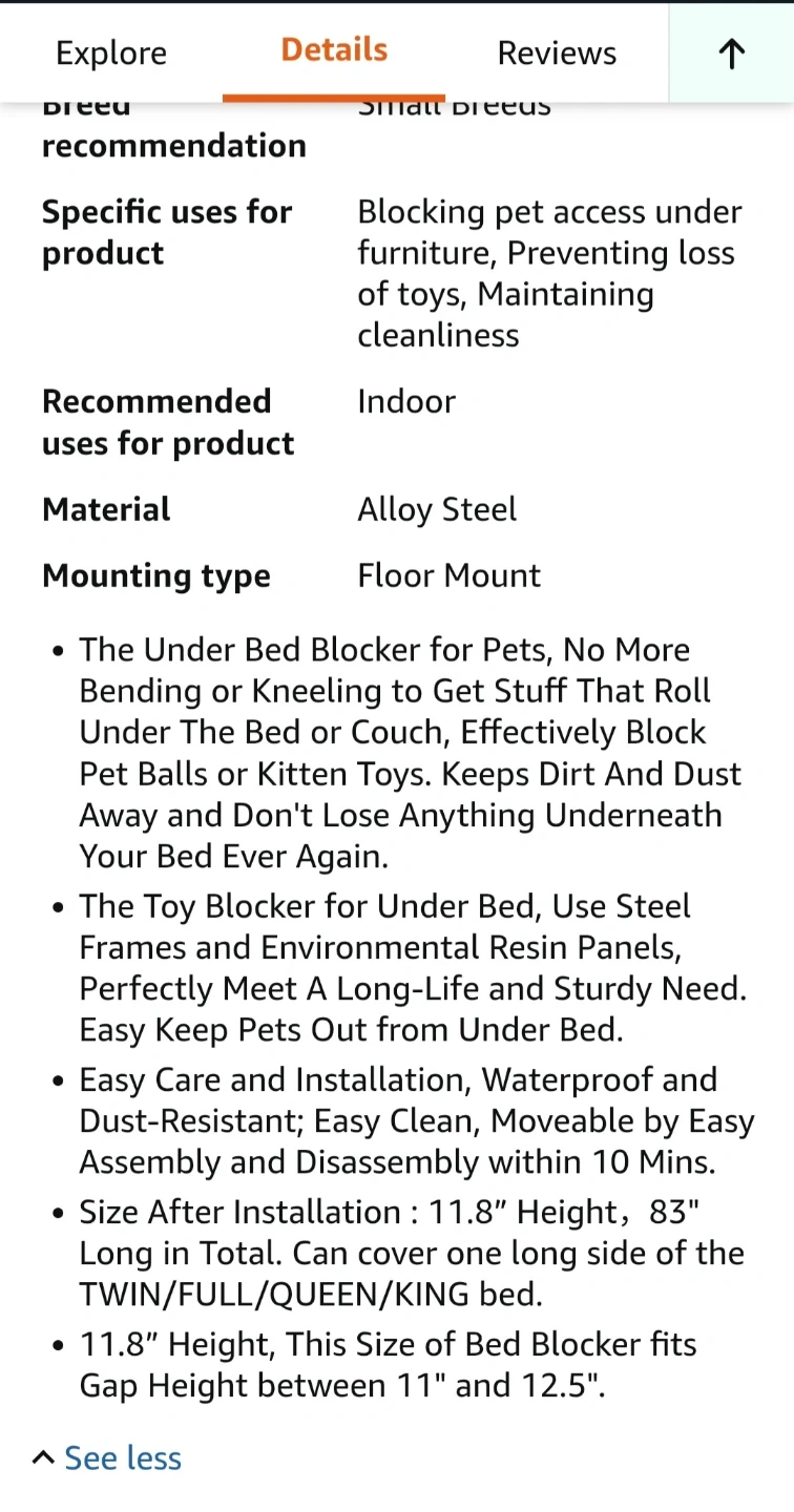This Qiyihome Under Bed Blocker is designed to keep pets and items from going under furniture. It's made with alloy steel frames and environmental resin panels for durability. Installation is easy and it's waterproof for simple care. Covers one side of a twin, full, queen, or king bed.