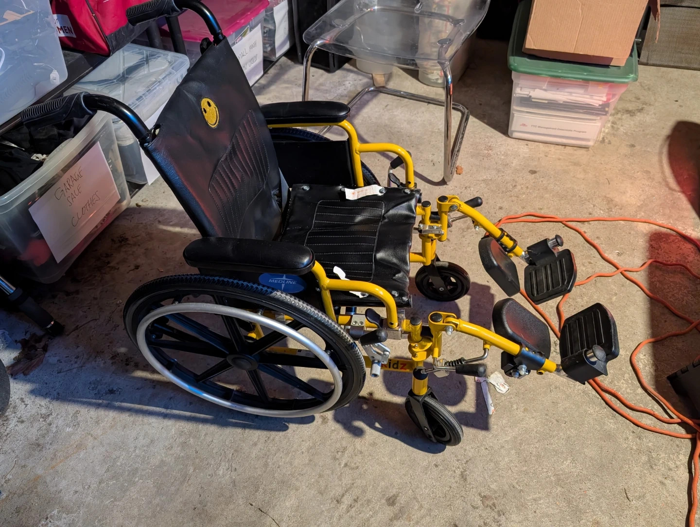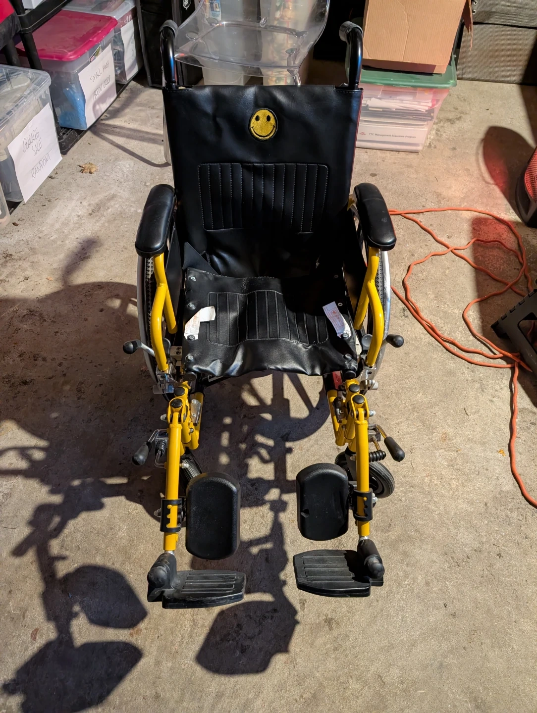 This is a wheelchair with a yellow frame and black seat. It features adjustable footrests and padded armrests. A smiley face patch is attached to the backrest.