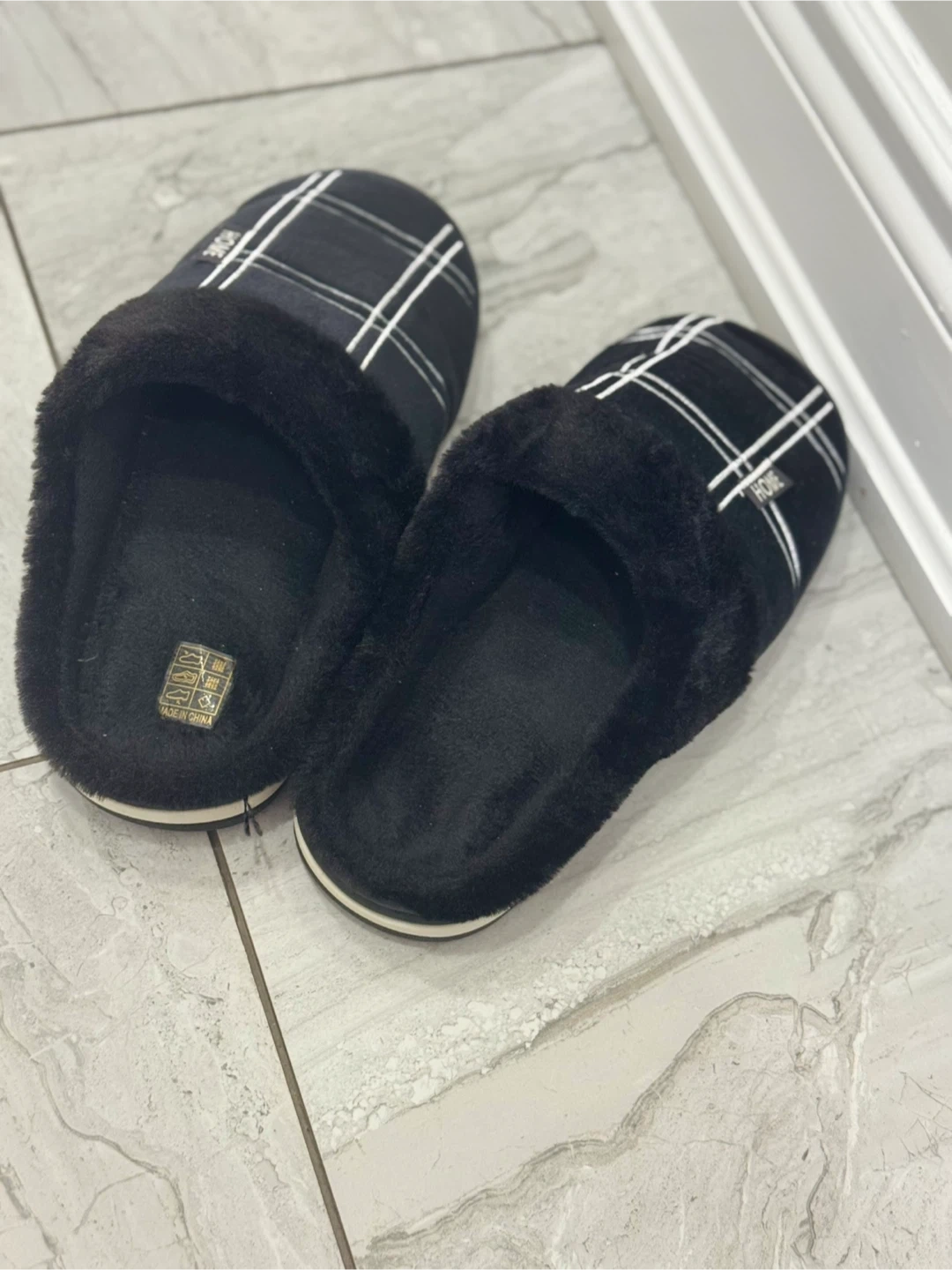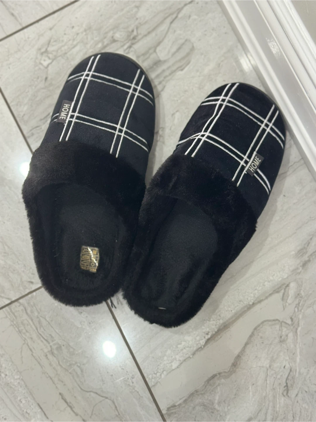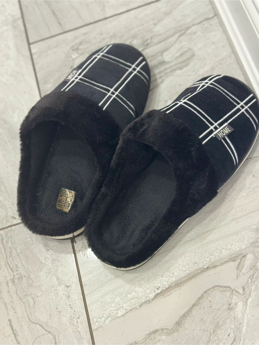 Cozy black slippers with a plaid pattern! They are super comfy and are perfect for wearing around the house on chilly days! They make your feet feel like your walking on clouds and are in size 10