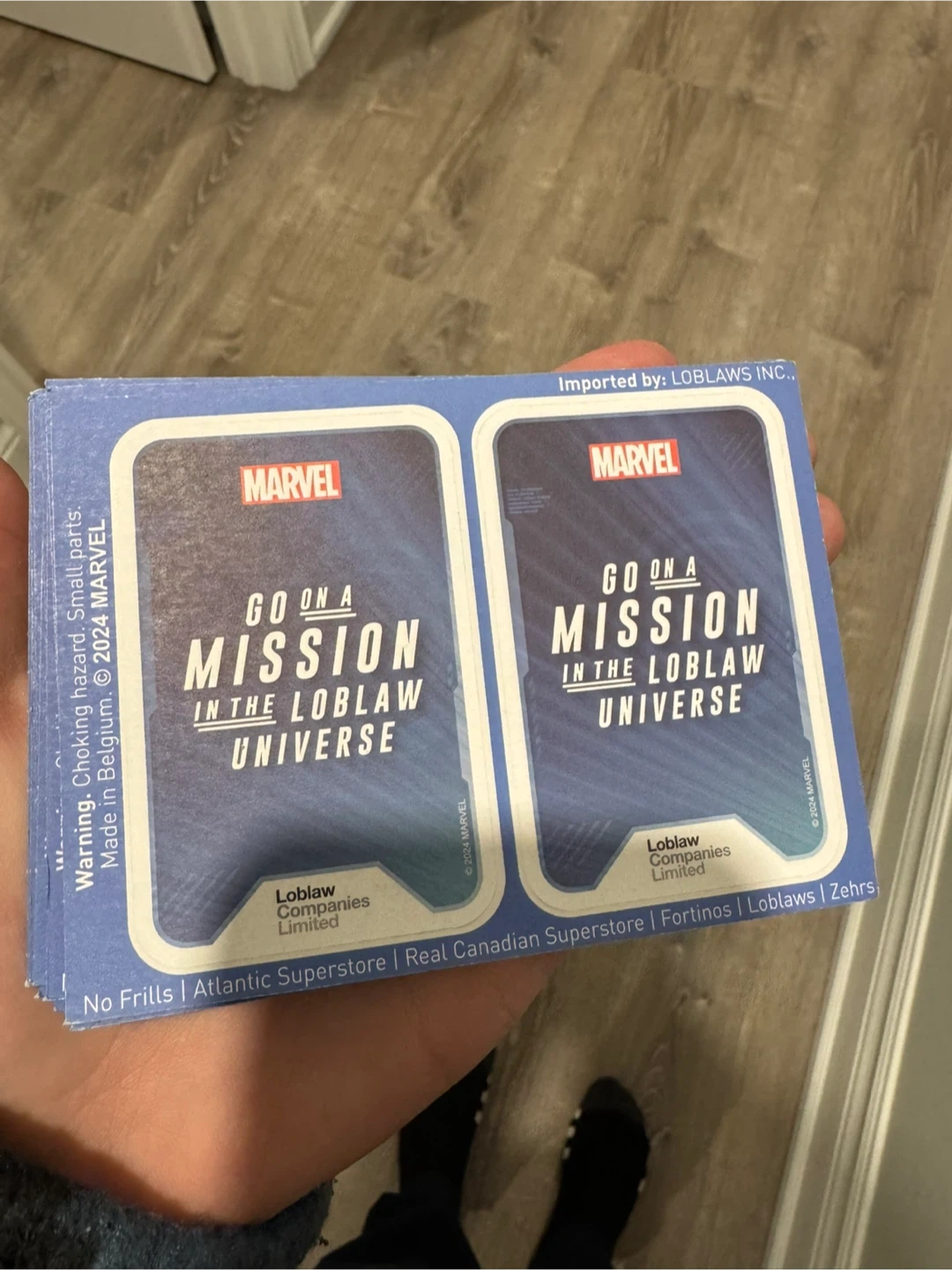 These are Marvel collectible cards from the Loblaw Universe promotion. They were made in Belgium and imported by Loblaws Inc. This set features cards from the 2024 collection.