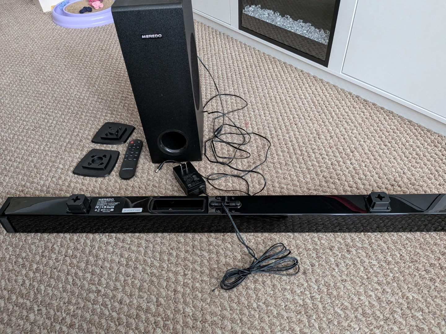 This Meredo sound system includes a soundbar, subwoofer, and two tower speakers. It comes with a remote control, power adapter, and a setup guide. Everything needed for enhanced audio is here!