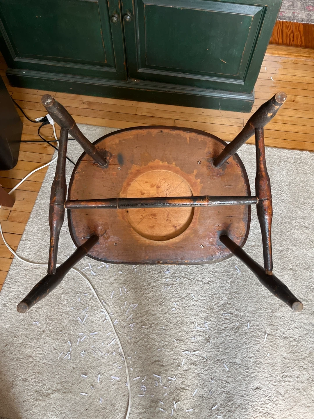 This is a classic primitive Windsor style armchair with a dark finish. It features a spindle back and gracefully curved arms. The wooden seat shows some signs of age and use, adding to its antique charm. This chair would be a lovely accent piece in any room.