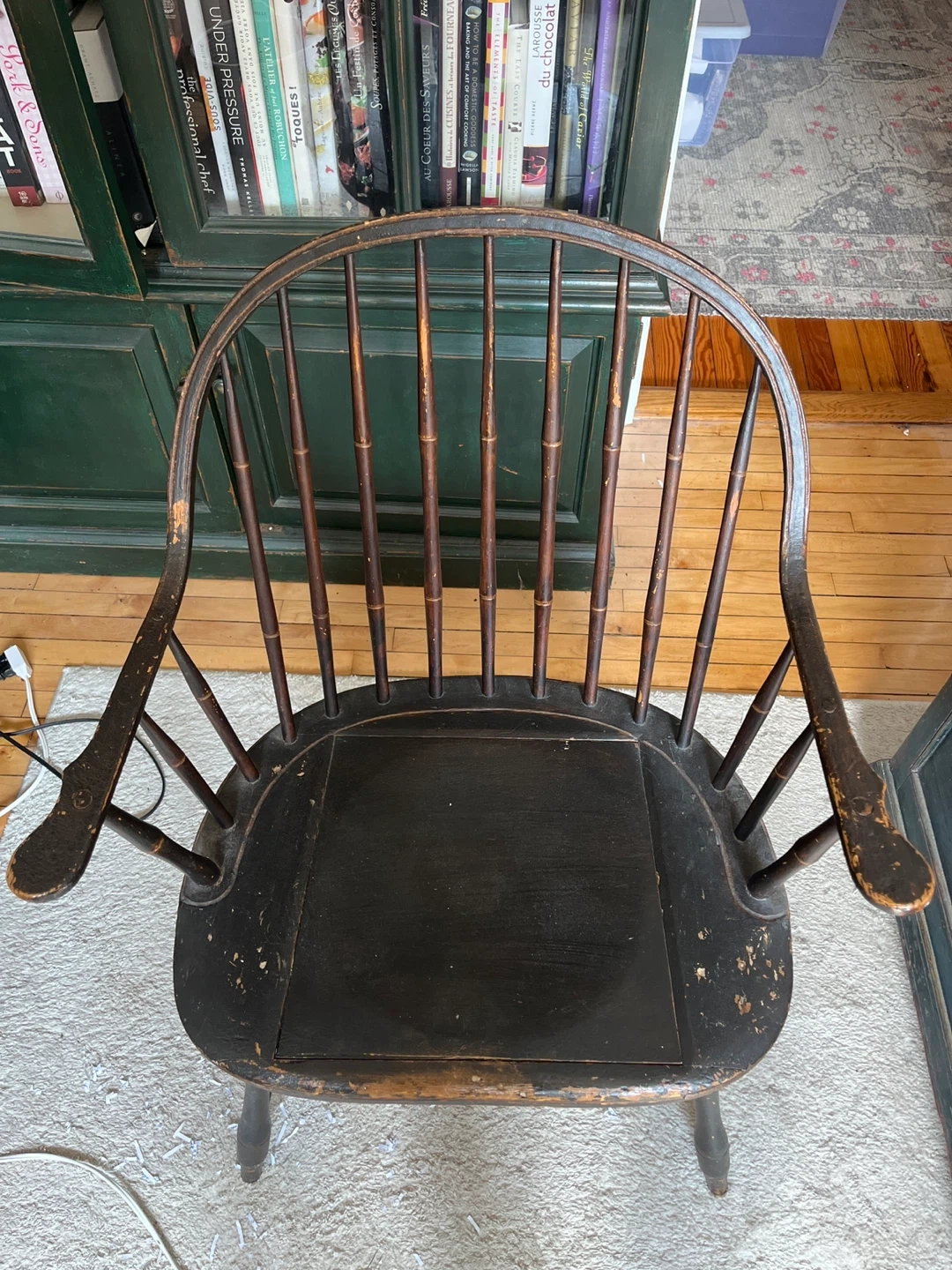 This is a classic primitive Windsor style armchair with a dark finish. It features a spindle back and gracefully curved arms. The wooden seat shows some signs of age and use, adding to its antique charm. This chair would be a lovely accent piece in any room.