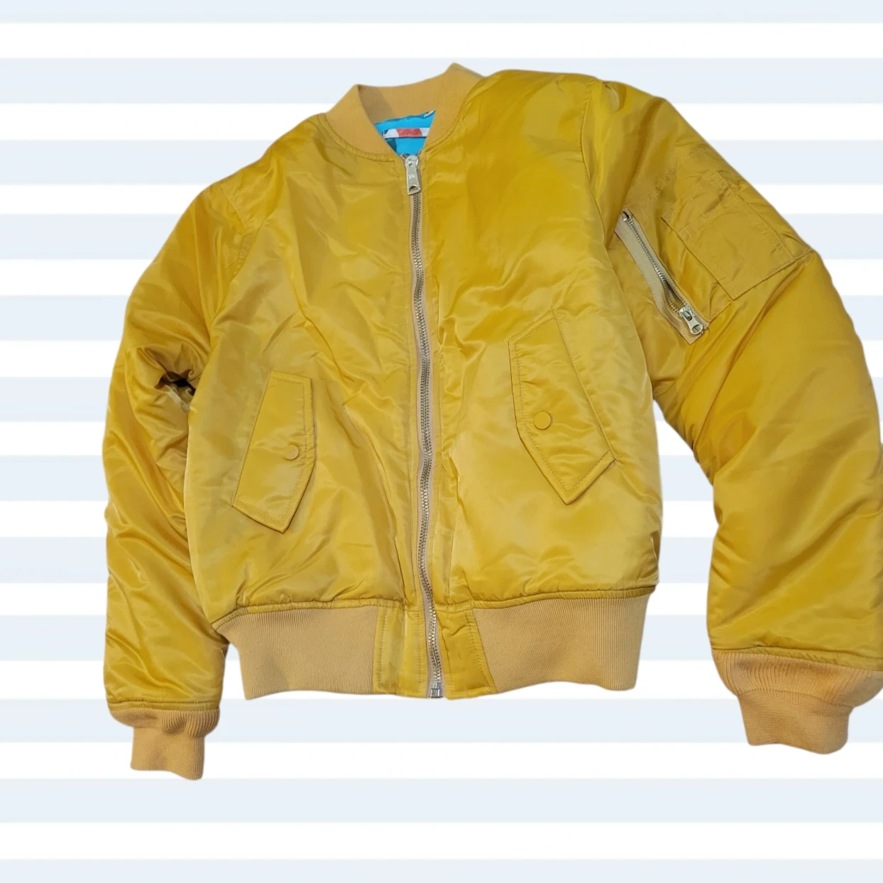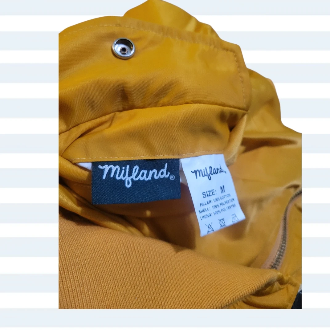 Yellow bomber jacket from Mifland. Size is medium. Shell is 100% polyester and lining is 100% polyester. Filler is 100% cotton. It's reversible with a colorful abstract print on the inside!