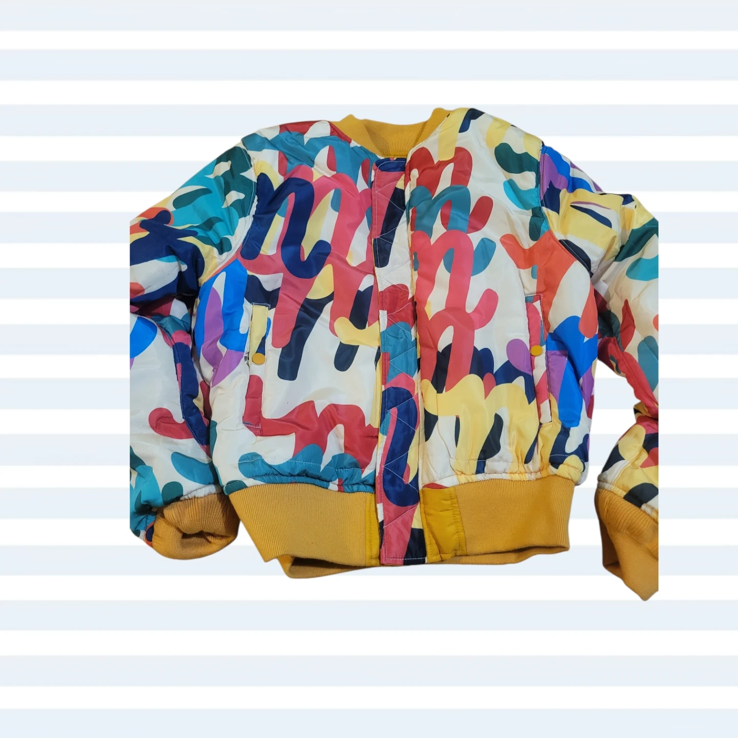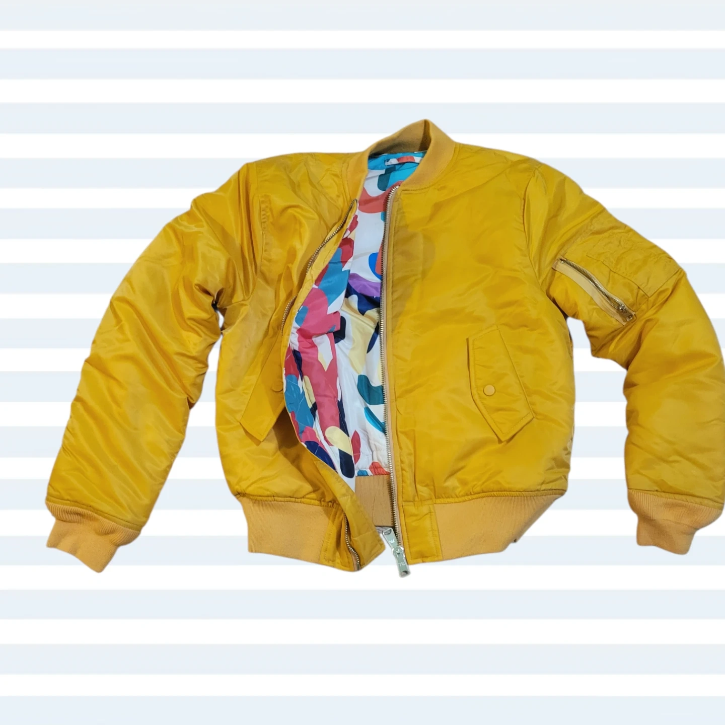 Yellow bomber jacket from Mifland. Size is medium. Shell is 100% polyester and lining is 100% polyester. Filler is 100% cotton. It's reversible with a colorful abstract print on the inside!