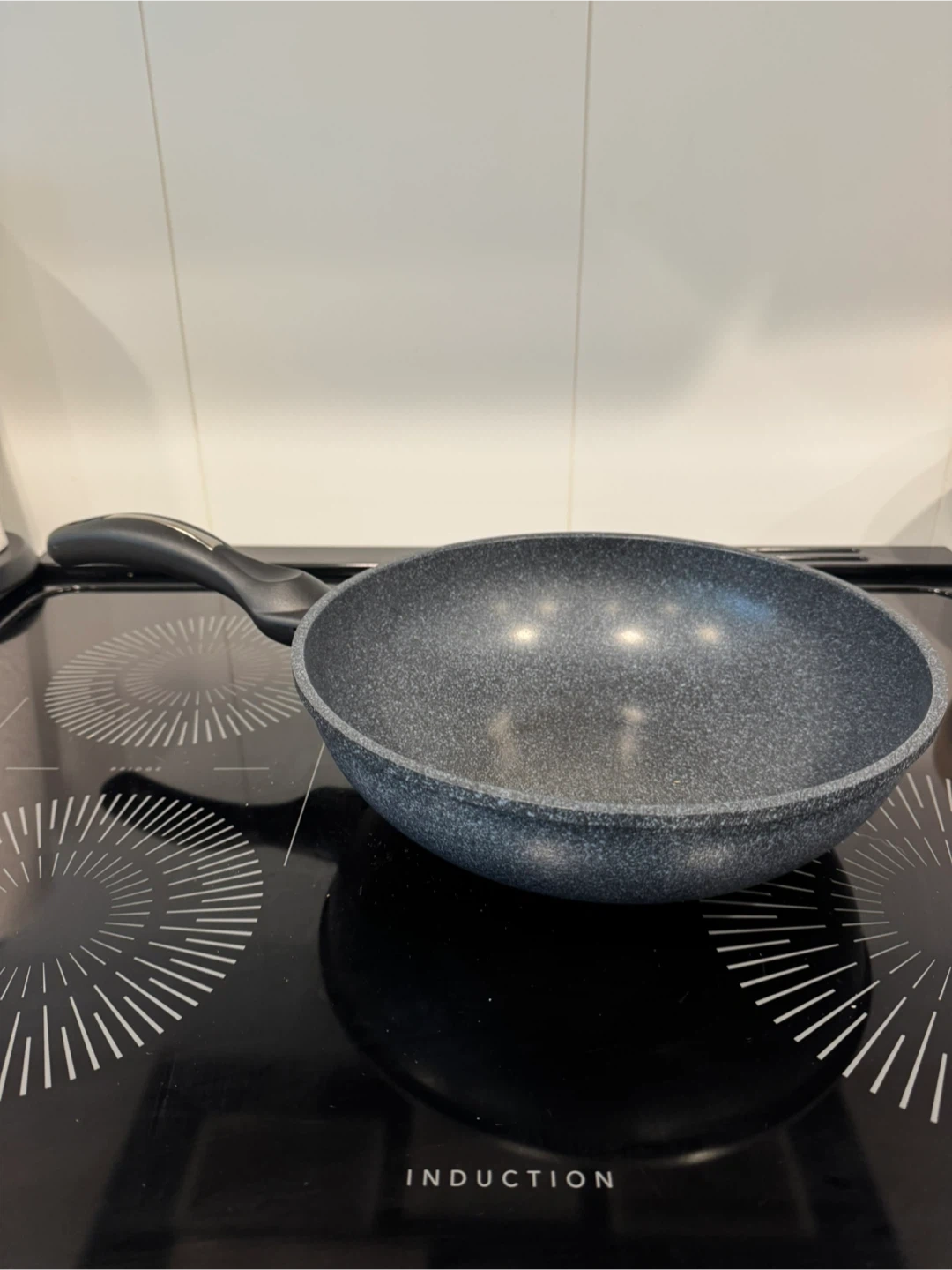 This is a granite non-stick wok pan. It has a comfortable handle and a durable construction. It's suitable for stir-frying and other high-heat cooking methods.
