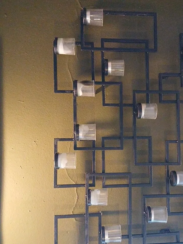 This eye-catching piece features a geometric metal frame holding multiple clear glass vases. It's perfect for adding a touch of modern elegance to any room. The metal is dark, and the vases are designed to hold small floral arrangements or decorative candles.