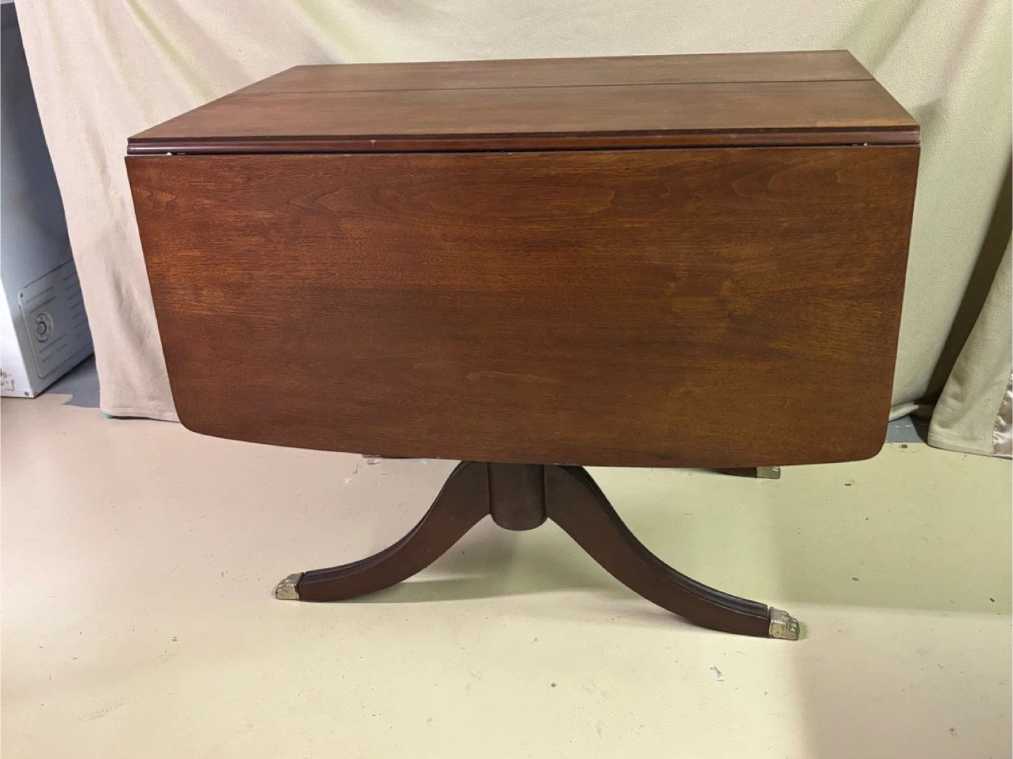 Wooden drop leaf dining table with a rich brown finish. It's a great space-saving piece that can extend for more dining room. The table features a pedestal base with elegant legs.