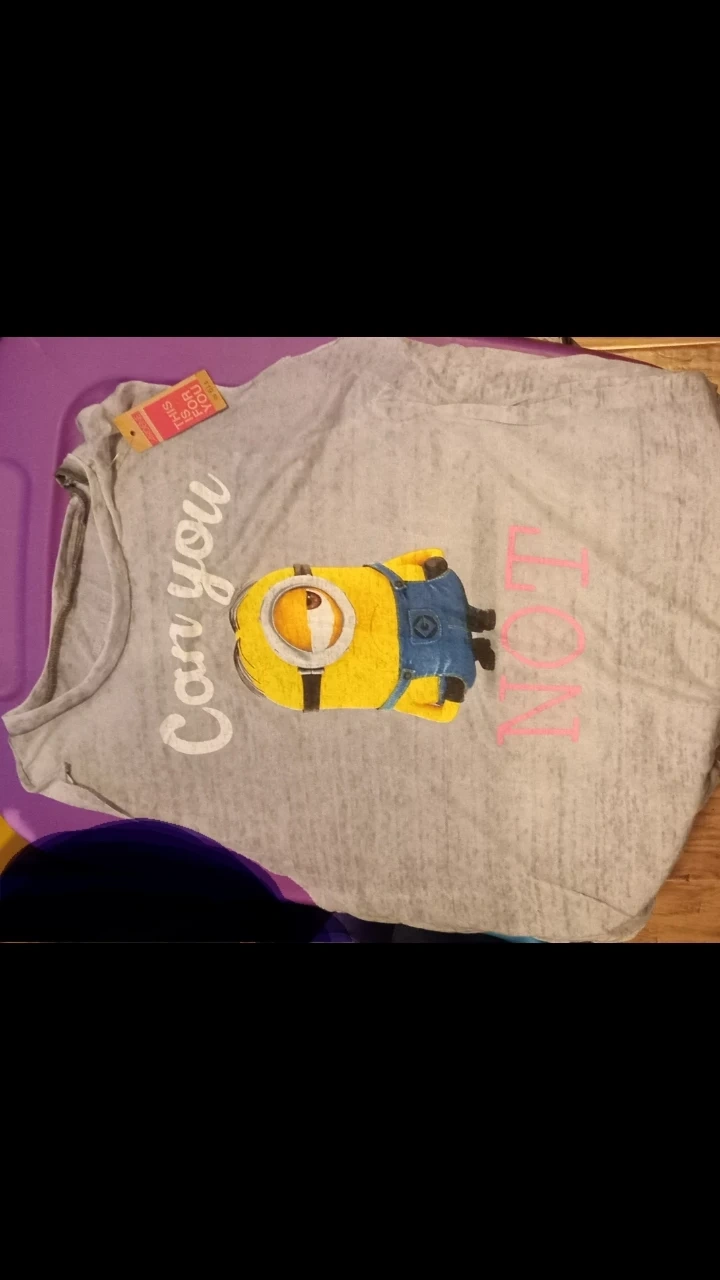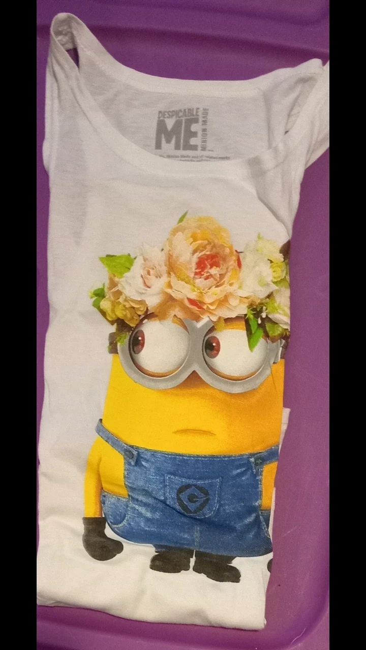 Two graphic t-shirts featuring Minions from Despicable Me. One grey shirt with text and a Minion graphic, and one white shirt with a Minion wearing a floral crown. Cotton blend material.