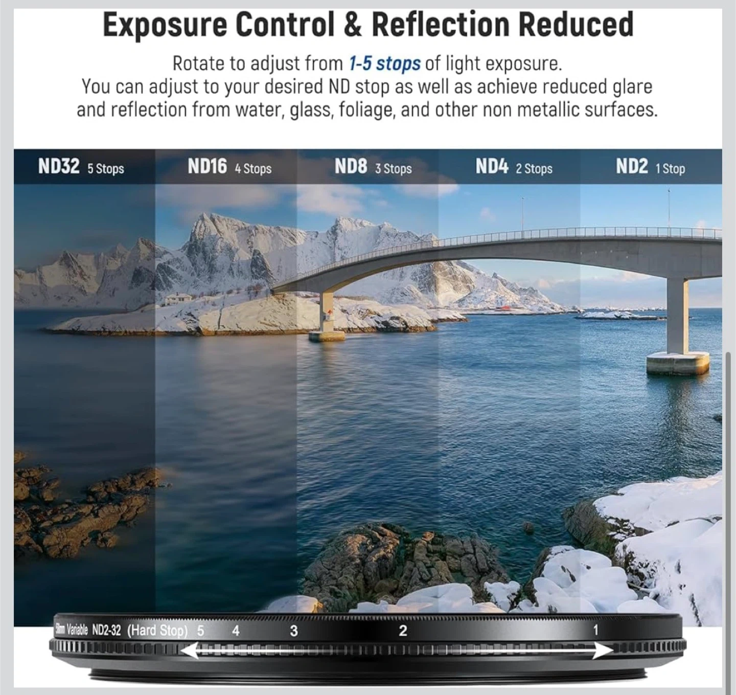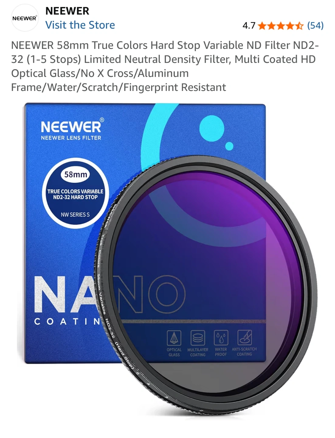 This Neewer 58mm variable ND filter allows for 1-9 stops of light exposure adjustment. It features a hard stop design with a click sound for easy gear adjustment. The filter is built with optical glass, multi-layer coating, and an aluminum frame, offering water, scratch, and fingerprint resistance.