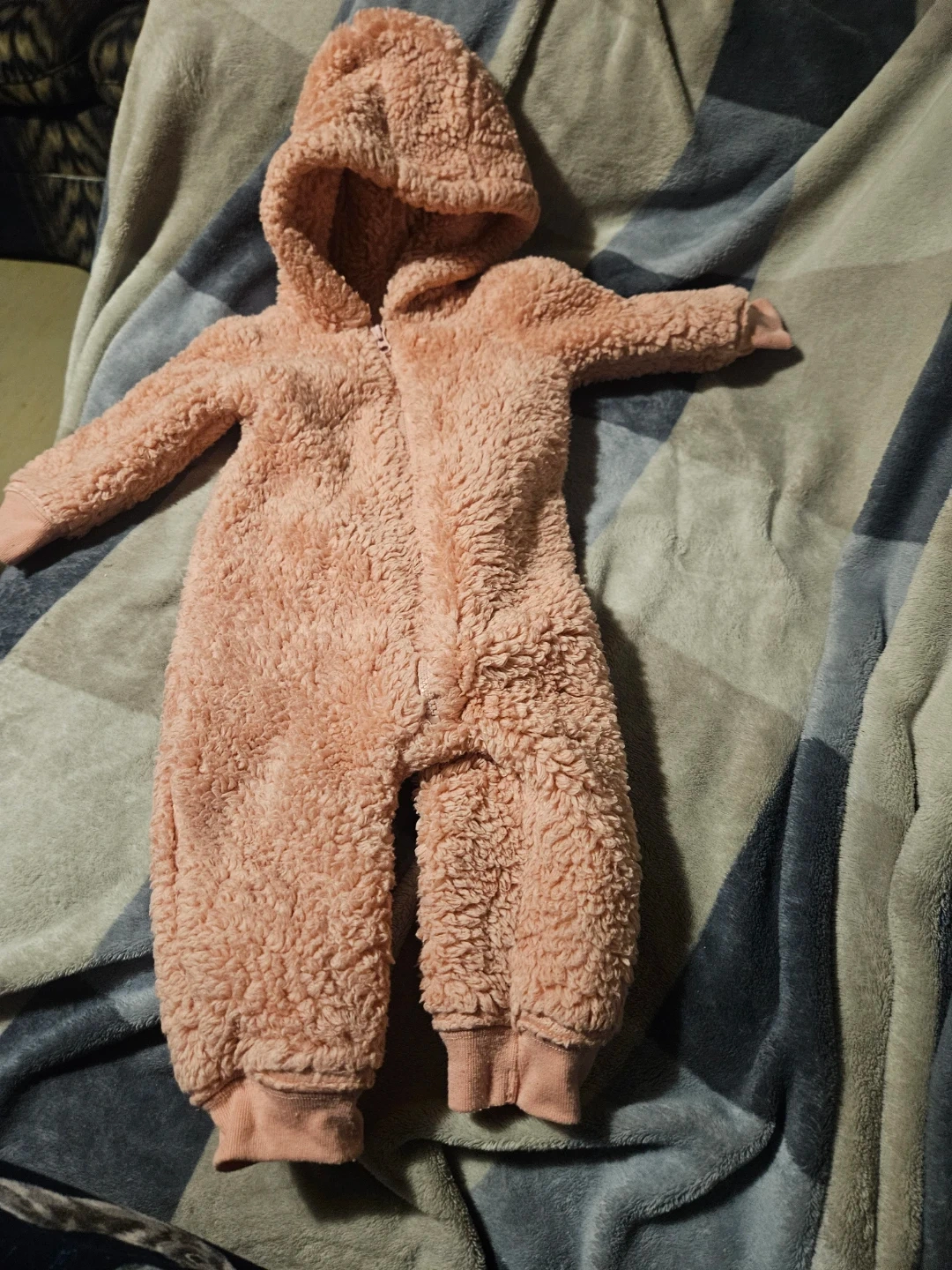 Soft pink fleece snowsuit from Carter's, perfect for keeping little ones cozy. It features a full zip front and a hood. Size 6-9 months. Ideal for cooler weather!