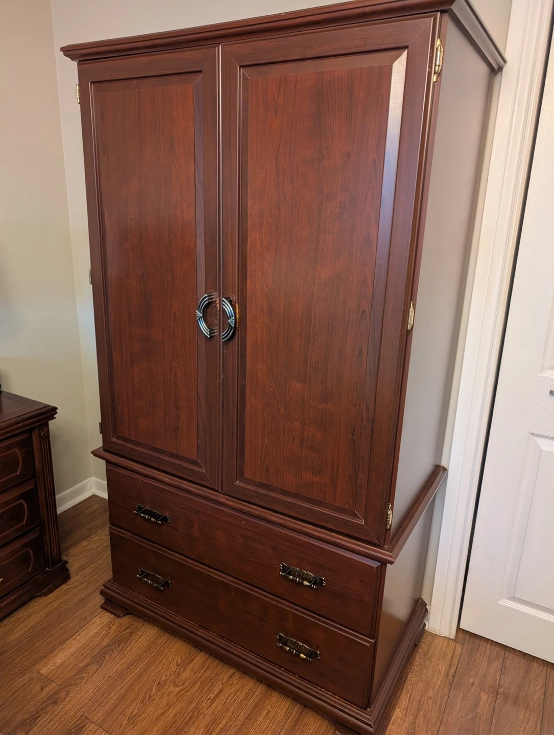This maple wood armoire features two doors opening to shelves and two bottom drawers for storage. It's a classic piece that'd work for clothing or media. The rich wood tone complements many bedroom decors. Already disassembled for easy pickup
