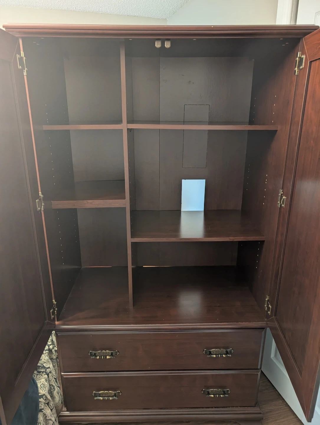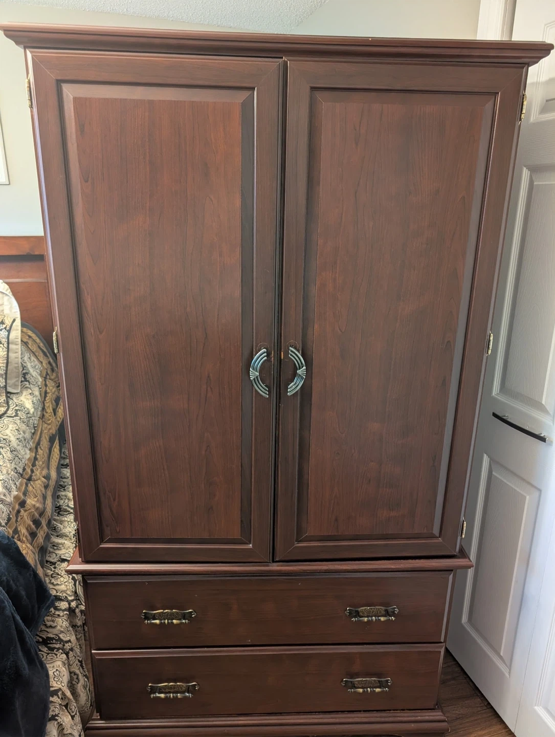 This maple wood armoire features two doors opening to shelves and two bottom drawers for storage. It's a classic piece that'd work for clothing or media. The rich wood tone complements many bedroom decors. Already disassembled for easy pickup