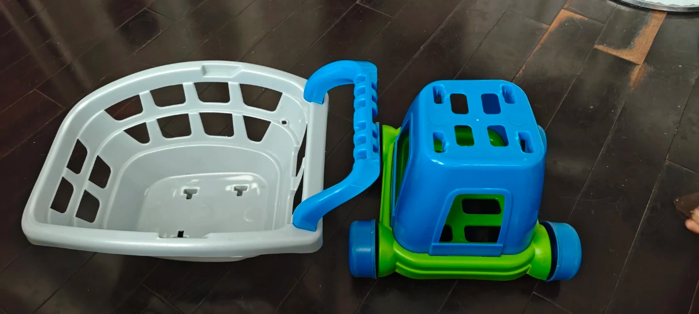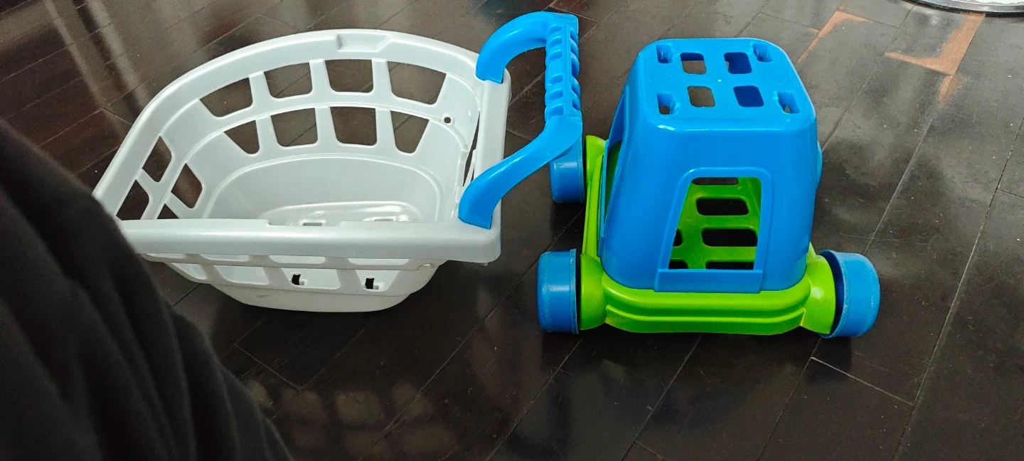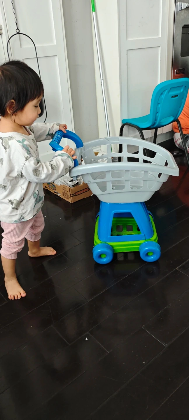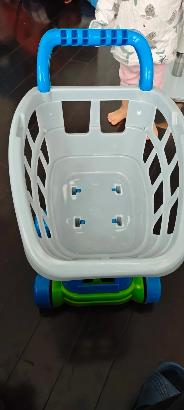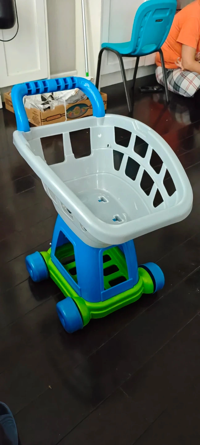 A fun plastic play shopping cart for kids. It's blue, green, and grey with wheels and a handle for pushing. Perfect for little ones to pretend they're grocery shopping!