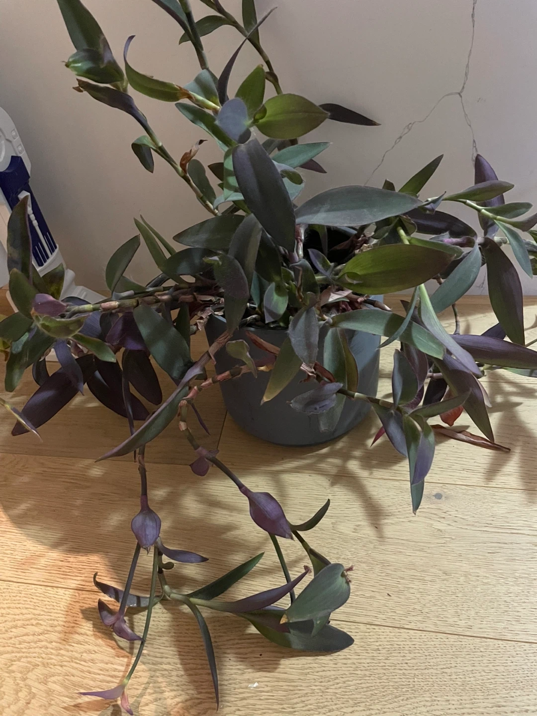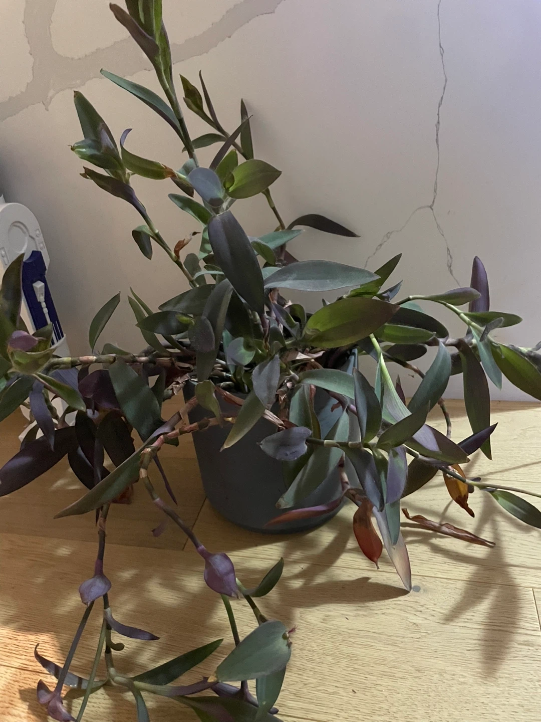 This is a healthy Purple Heart plant in a dark grey ceramic pot. It's a trailing plant with lovely purple and green foliage. It's ready for a new home!
