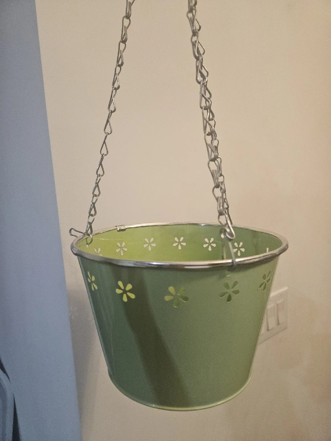 giving a cute green hanging planter! It has a lovely daisy cut-out design and a silver chain for hanging. Perfect for adding a touch of greenery to your home or balcony