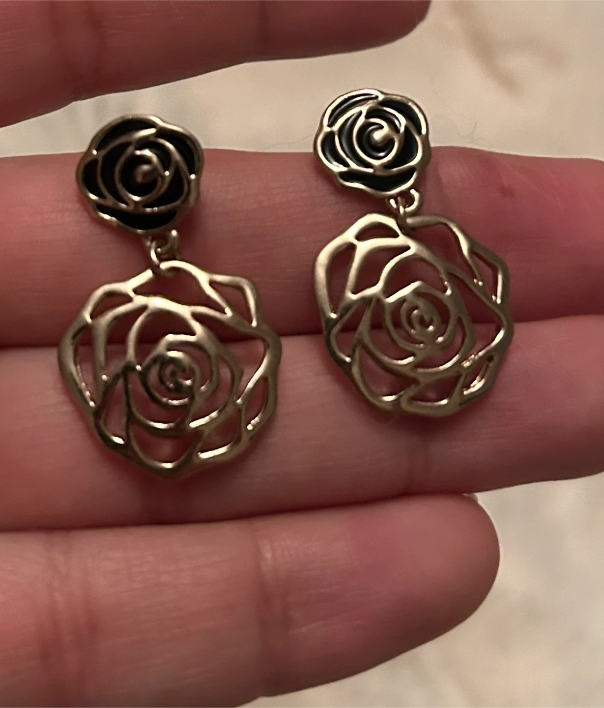 These earrings feature a rose design. They have a gold-toned metal construction with black enamel accents. They dangle from a rose-shaped stud.