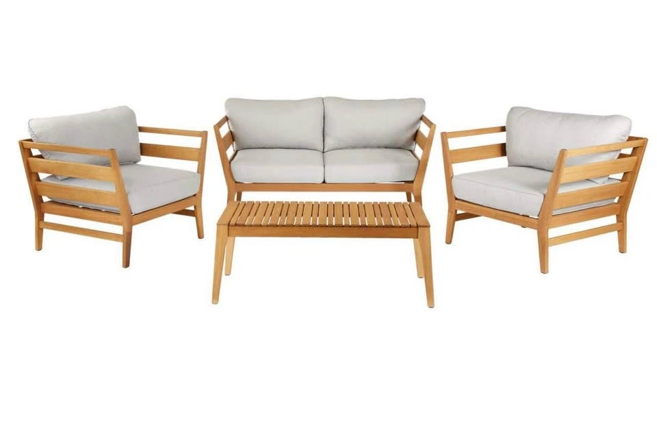 The CANVAS Capilano 4-Piece Conversation Set is made from FSC-certified eucalyptus wood with a natural multi-coat oiled finish for longevity and style. Plump, plush, water-, stain-, and fade- resistant cushions, protected by Tripel. Beautiful modern design is perfect for any outdoor space. Set includes: 1 loveseat, 2 club chairs, 1 coffee table