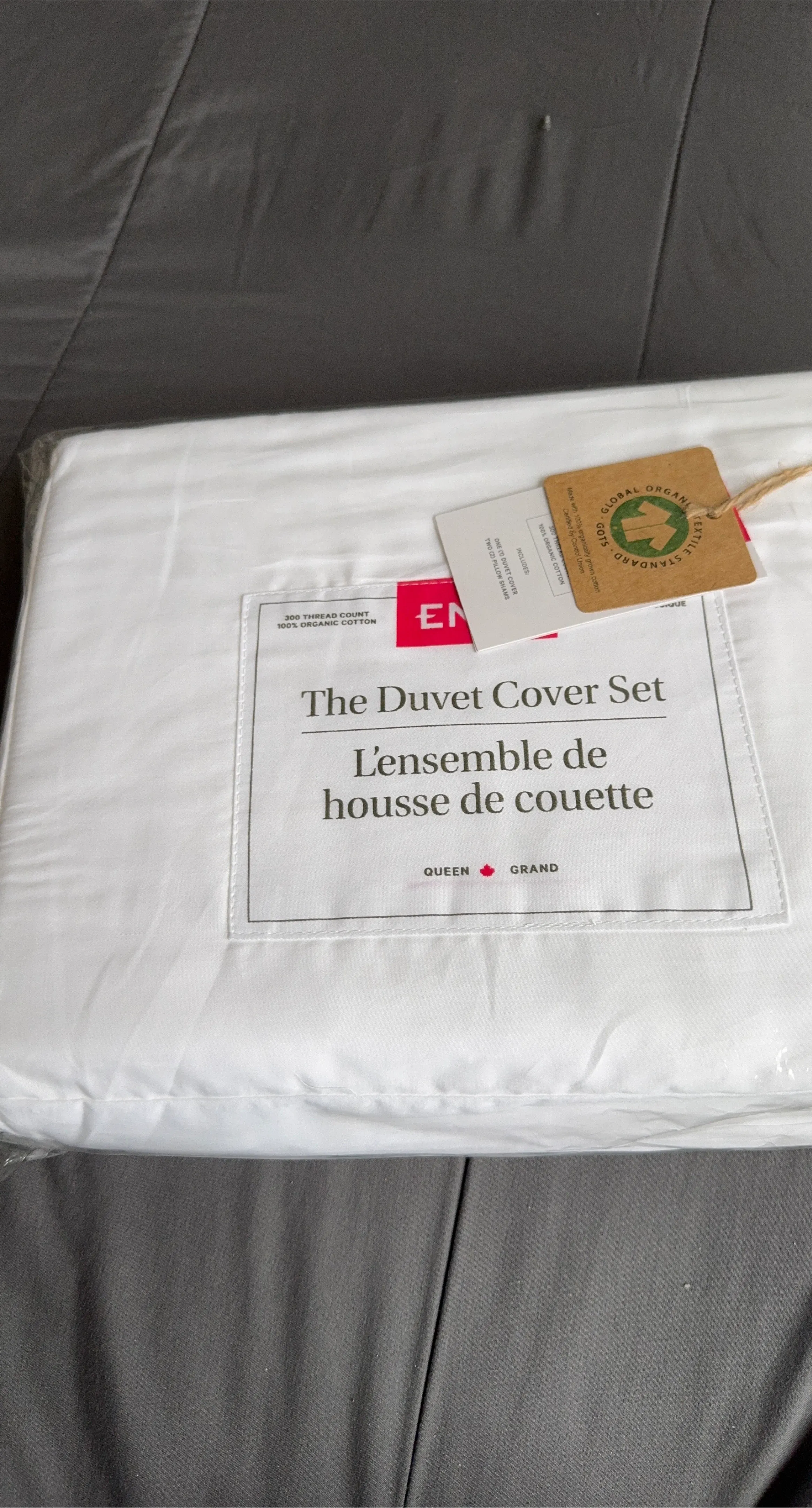 This is a queen size duvet cover set made from 100% organic cotton with a 300 thread count. It includes one duvet cover and two pillow shams. Made with organically grown cotton.