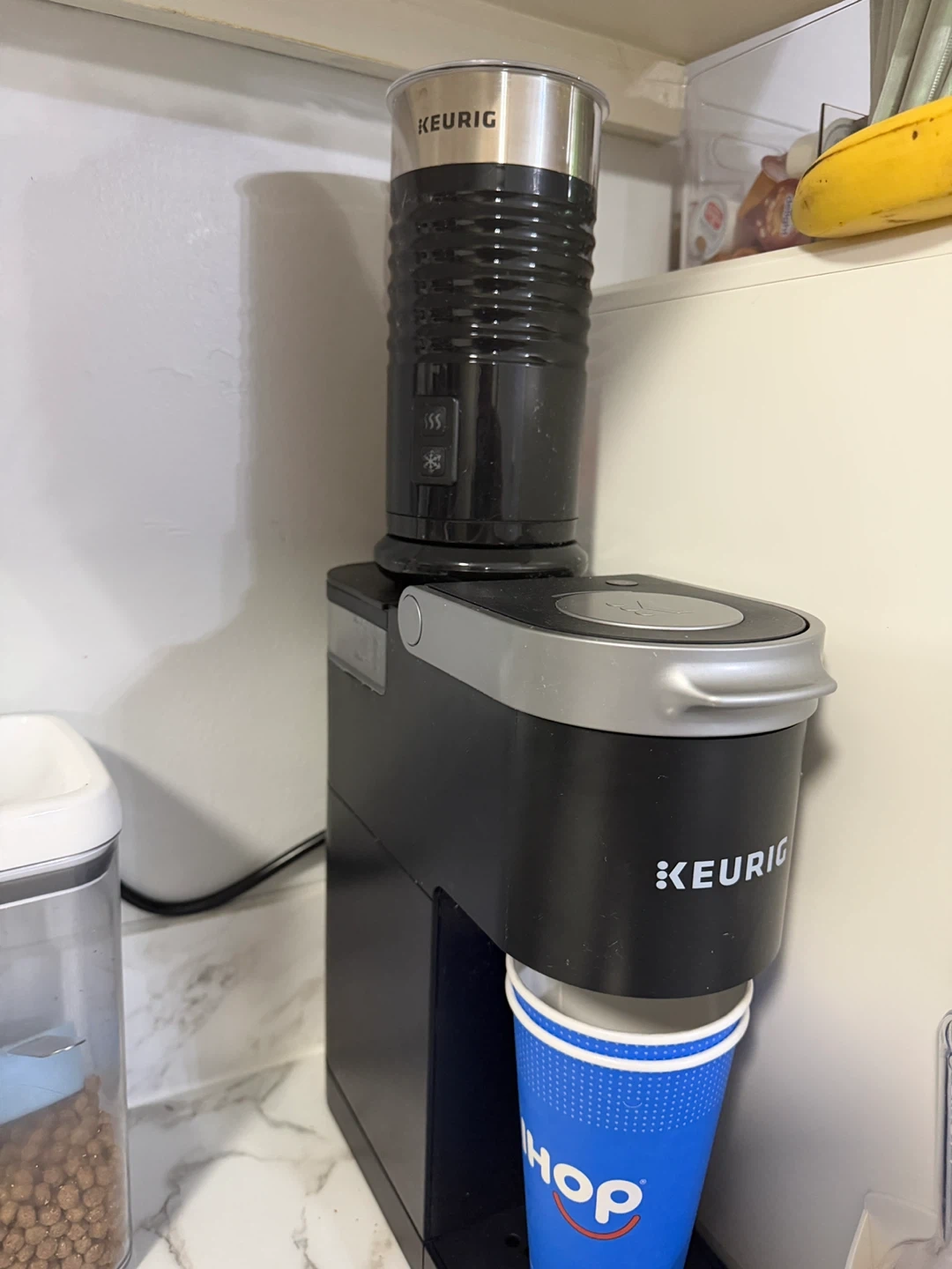 This Keurig K-Mini Plus coffee maker is black and comes with a matching milk frother. It's a compact machine perfect for single servings. The frother is great for making lattes and cappuccinos!