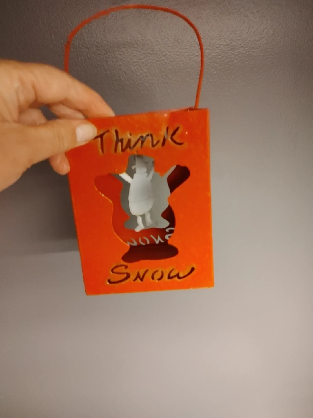 Along with another Christmas decoration h is a metal shopping bag with a handle.