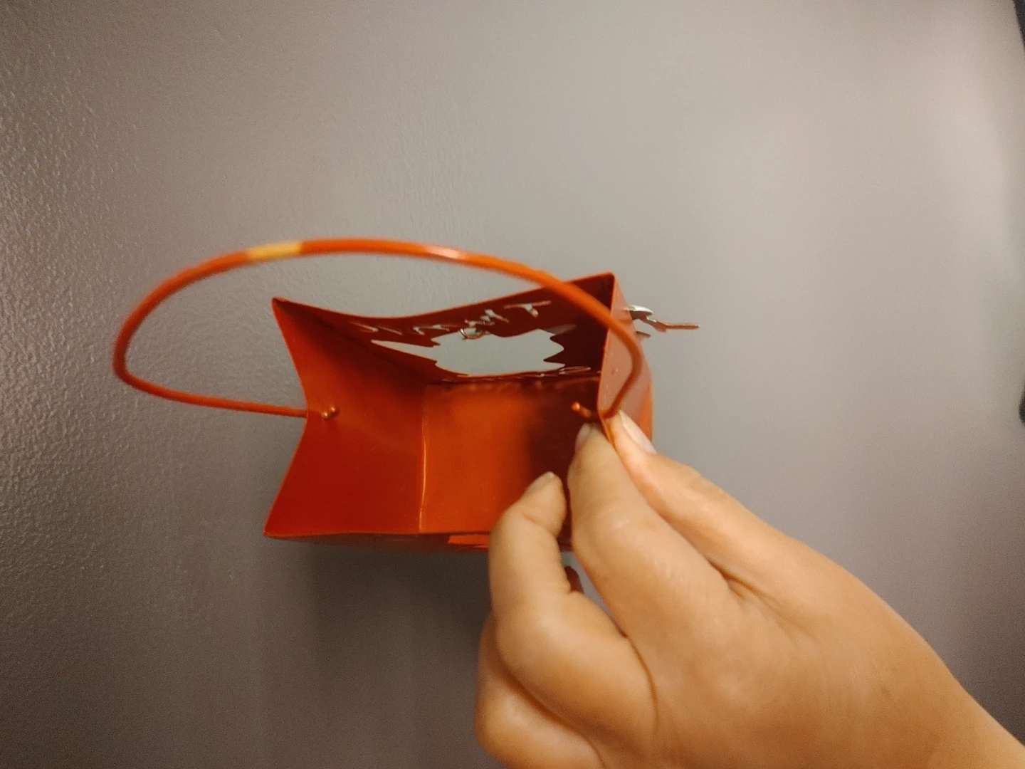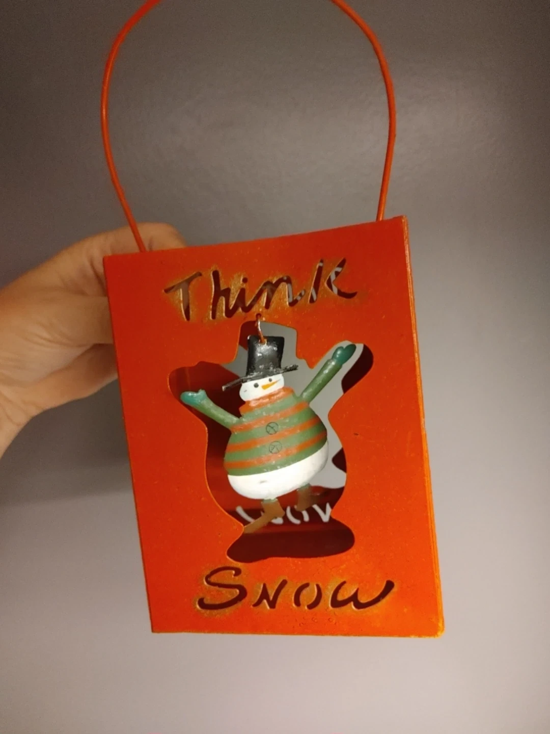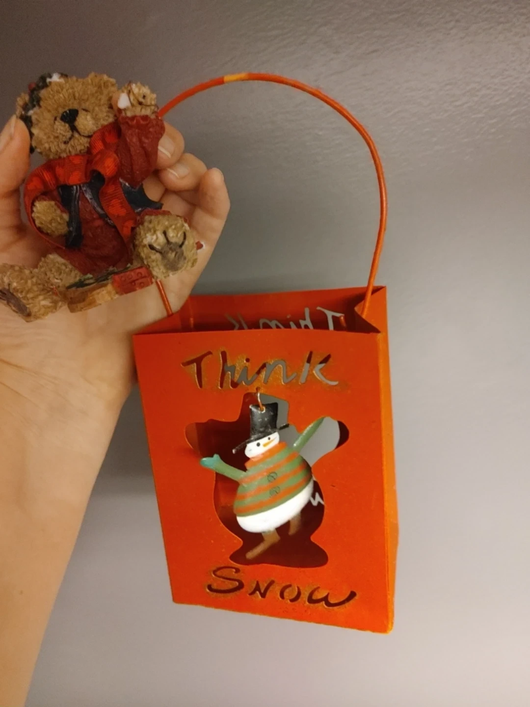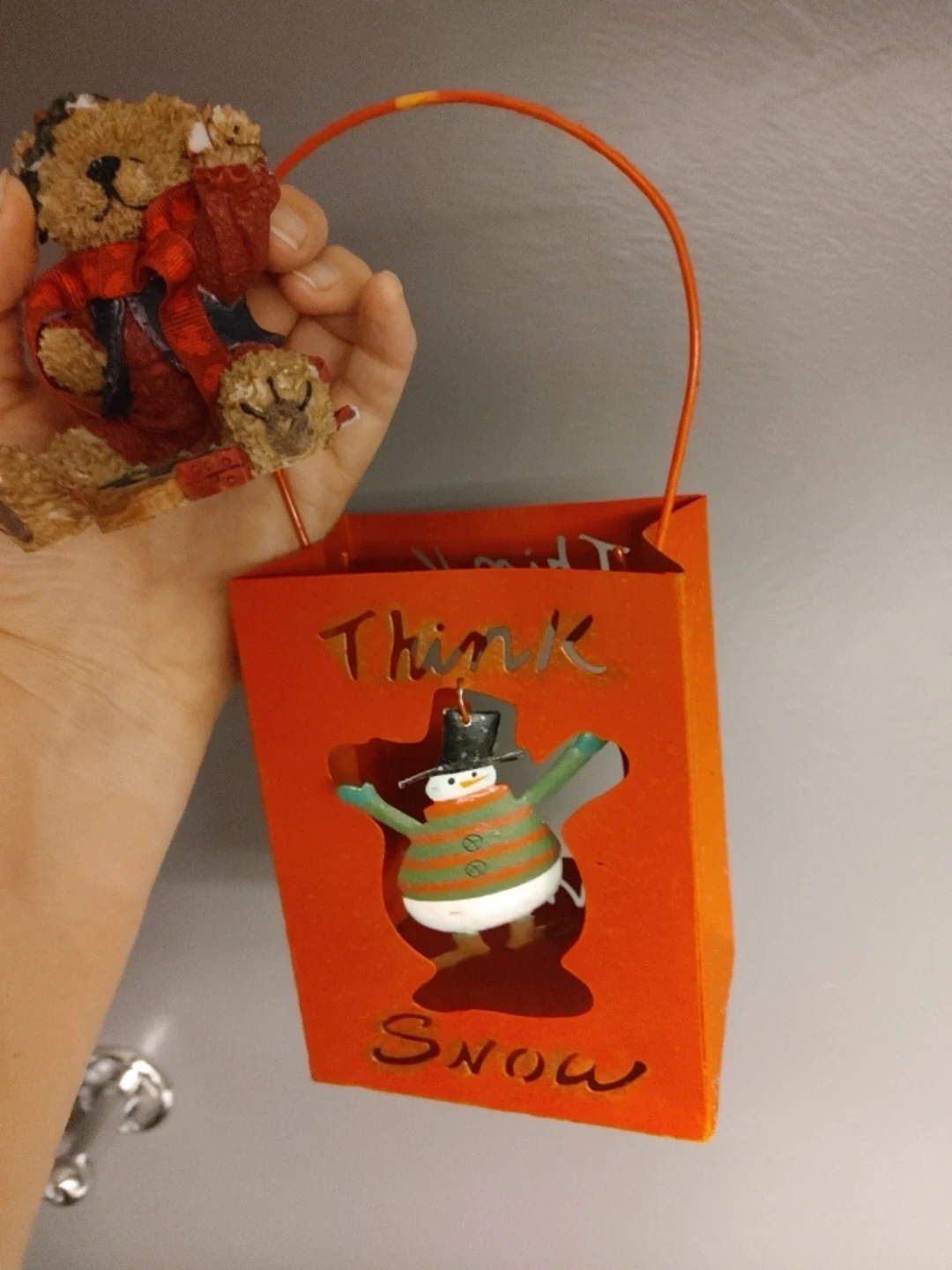 Along with another Christmas decoration h is a metal shopping bag with a handle.