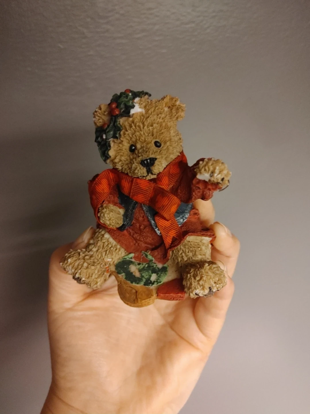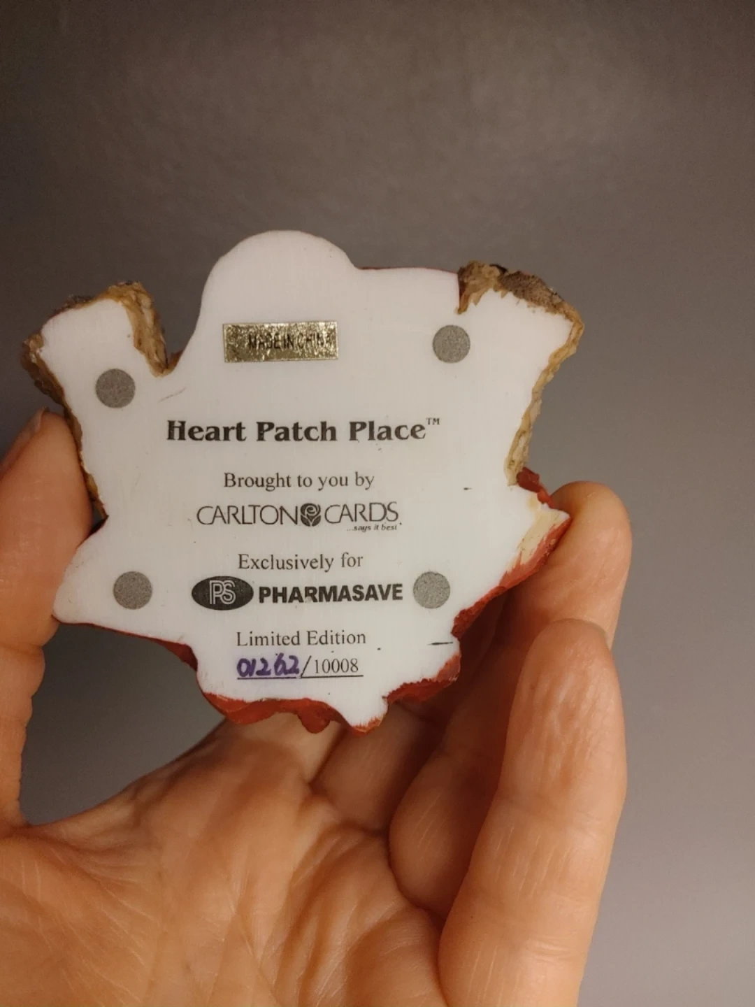 This is a limited edition figurine from Carlton Cards, exclusively made for Pharmasave. It features a teddy bear in festive holiday attire. The item is marked as limited edition 01262/10008.