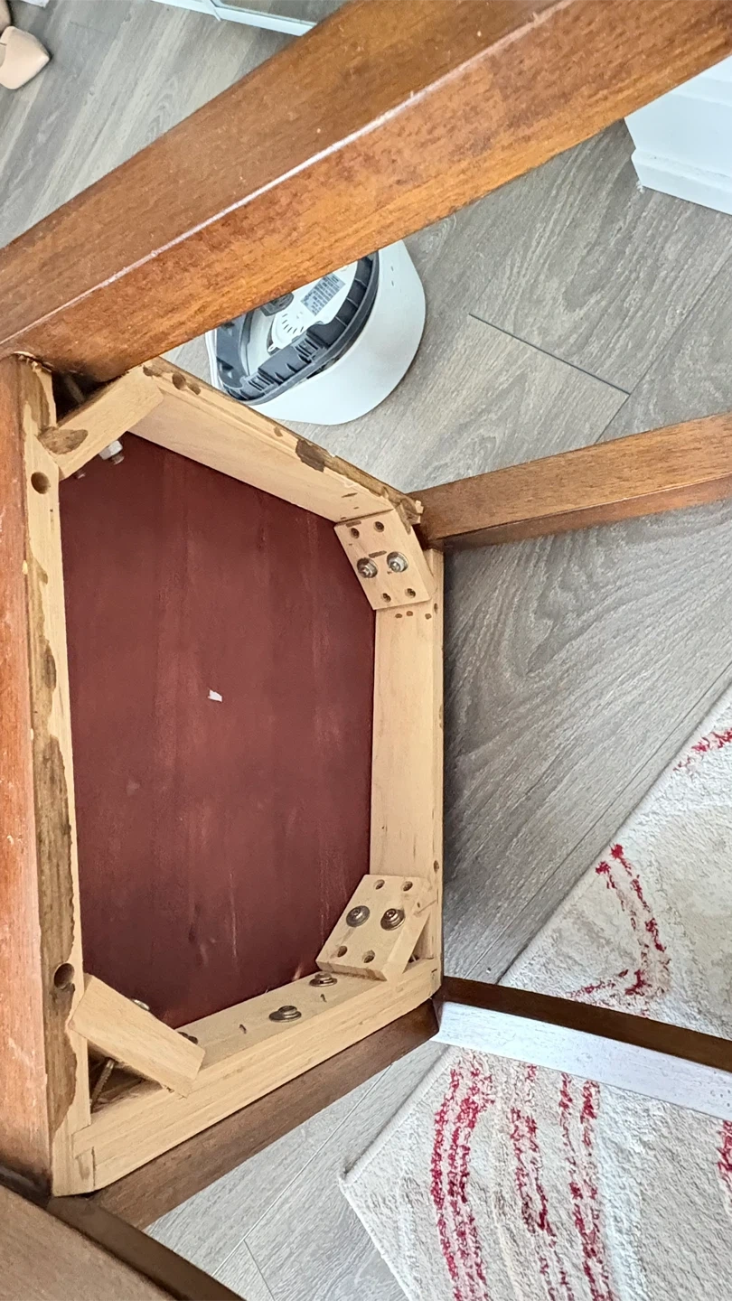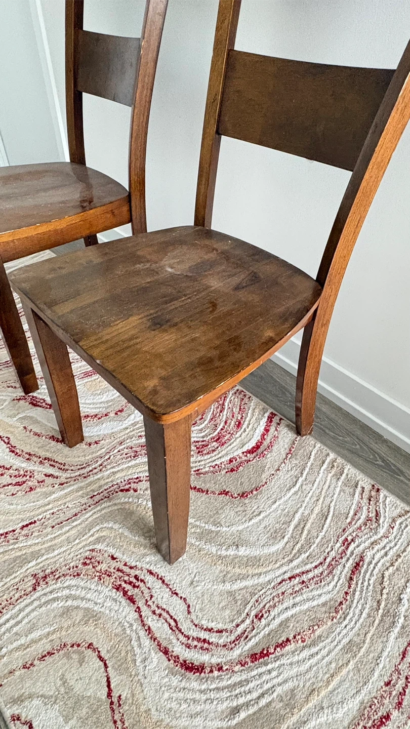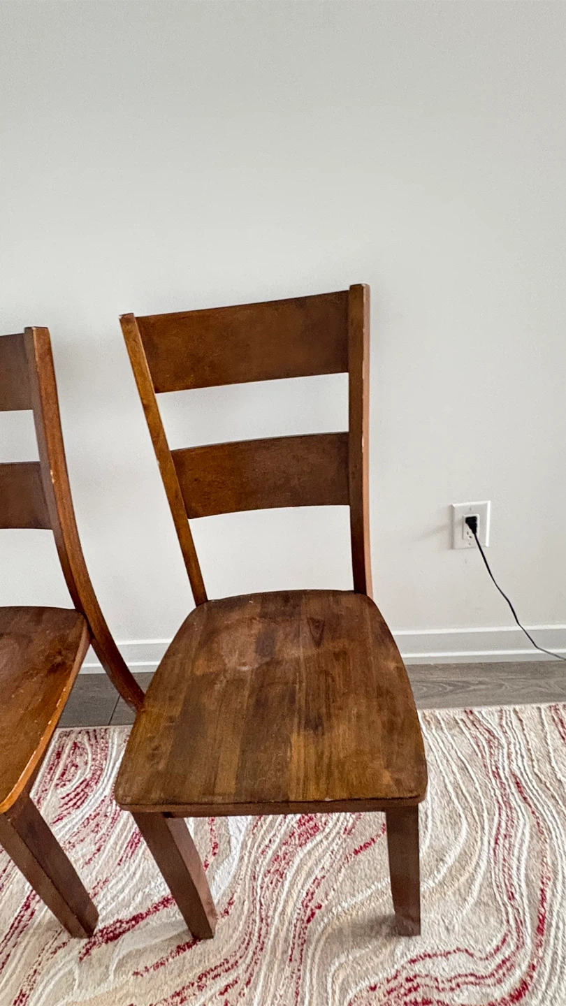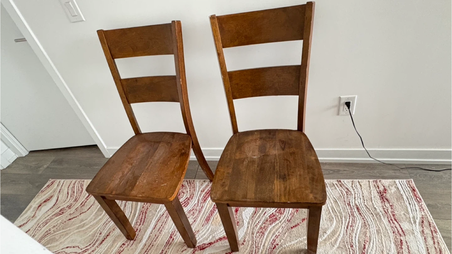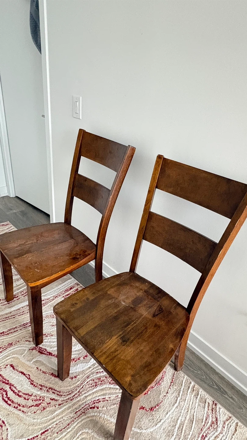 A pair of wooden dining chairs. They're a warm brown colour. Great for a dining set or as extra seating!