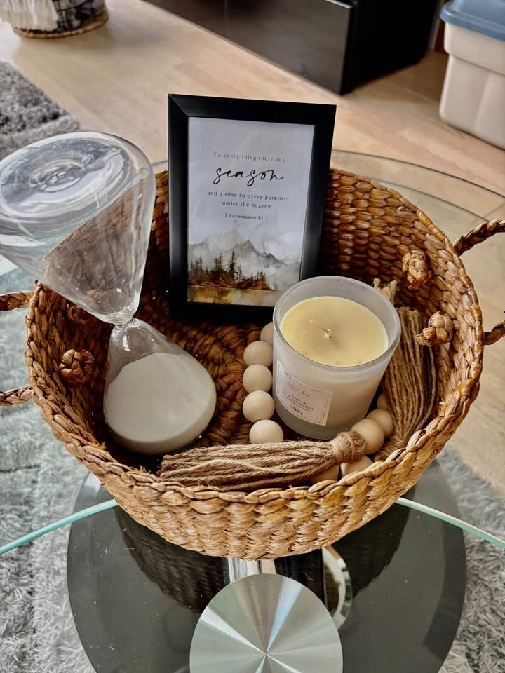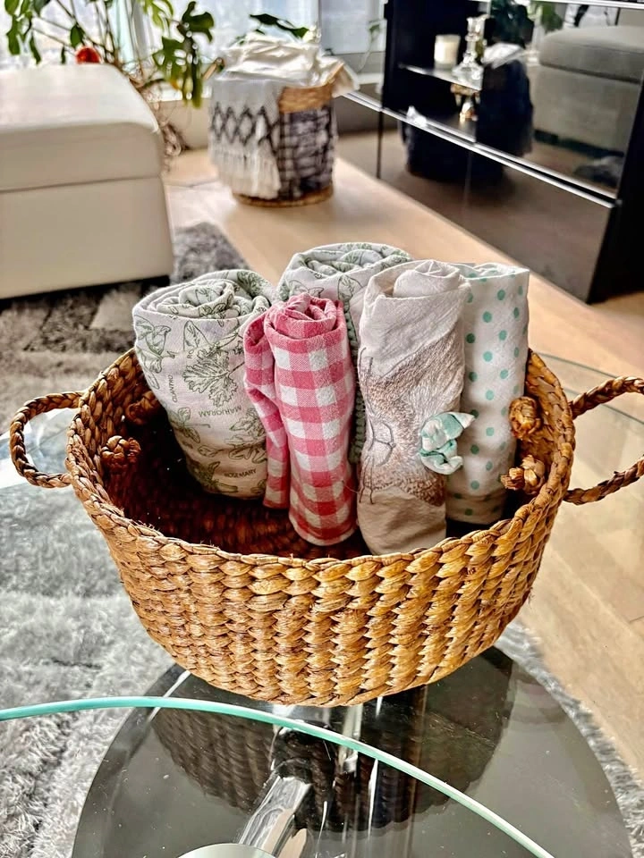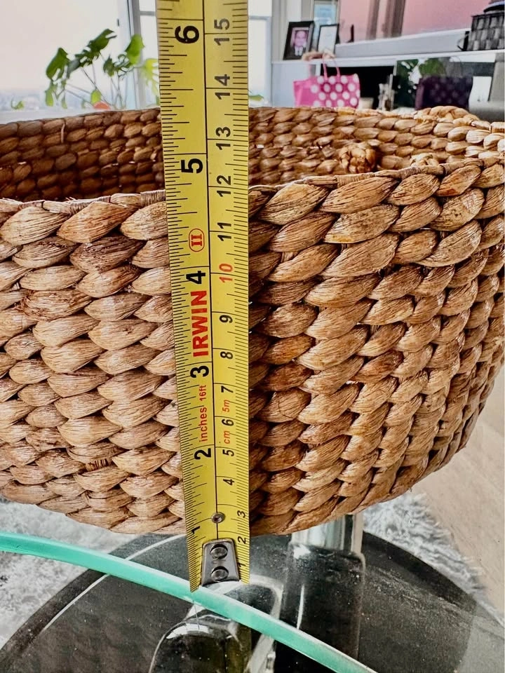 Cute woven basket. Great for storage or decor. Has handles on the sides. Measures about 11.5 inches across and 5.5 inches tall. Made in the Philippines.