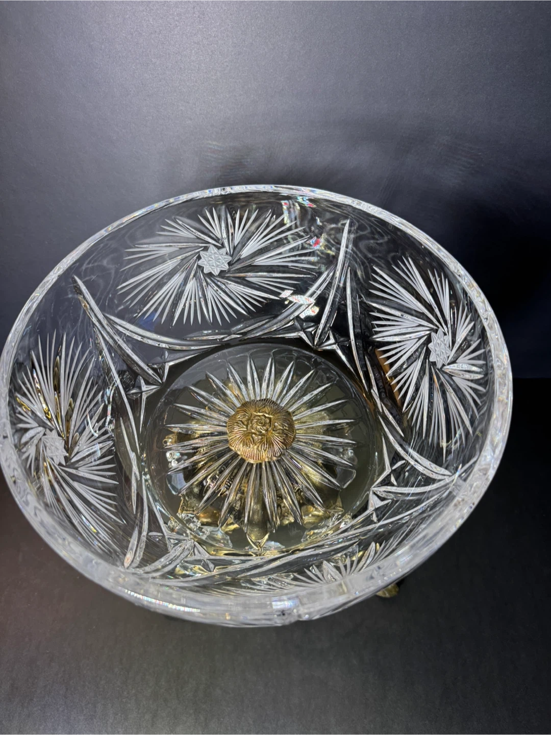 Beautiful crystal bowl with intricate fan and star patterns, set on a decorative brass stand. It's adorned with dangling clear crystal prisms. This piece adds a touch of elegance to any room. High 12 inches,wide 10 inches