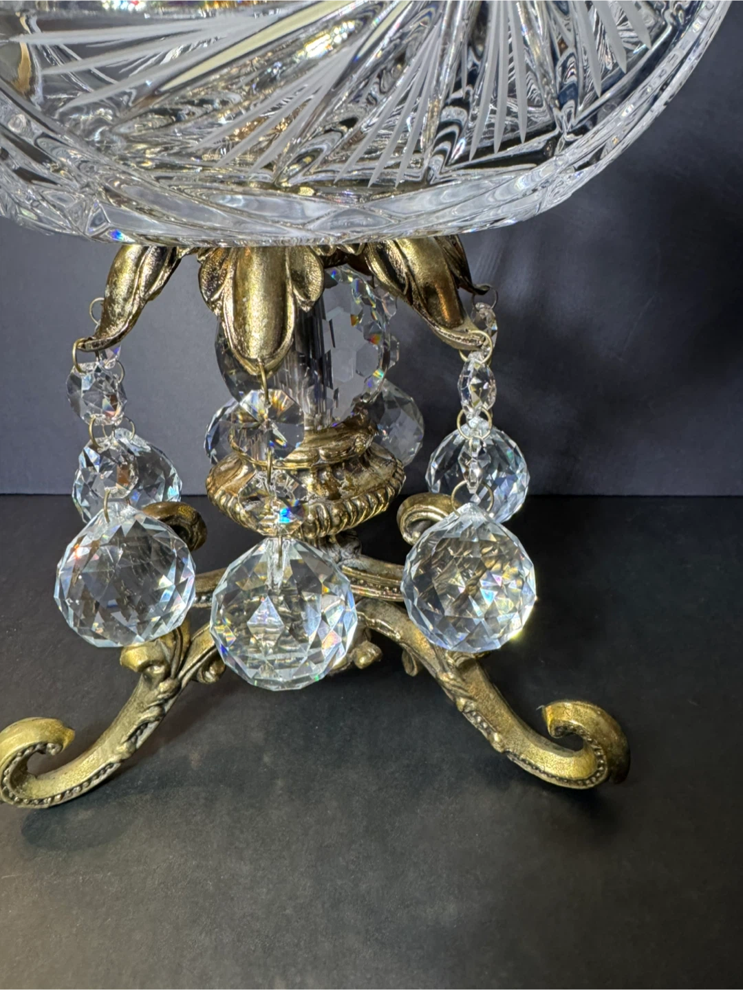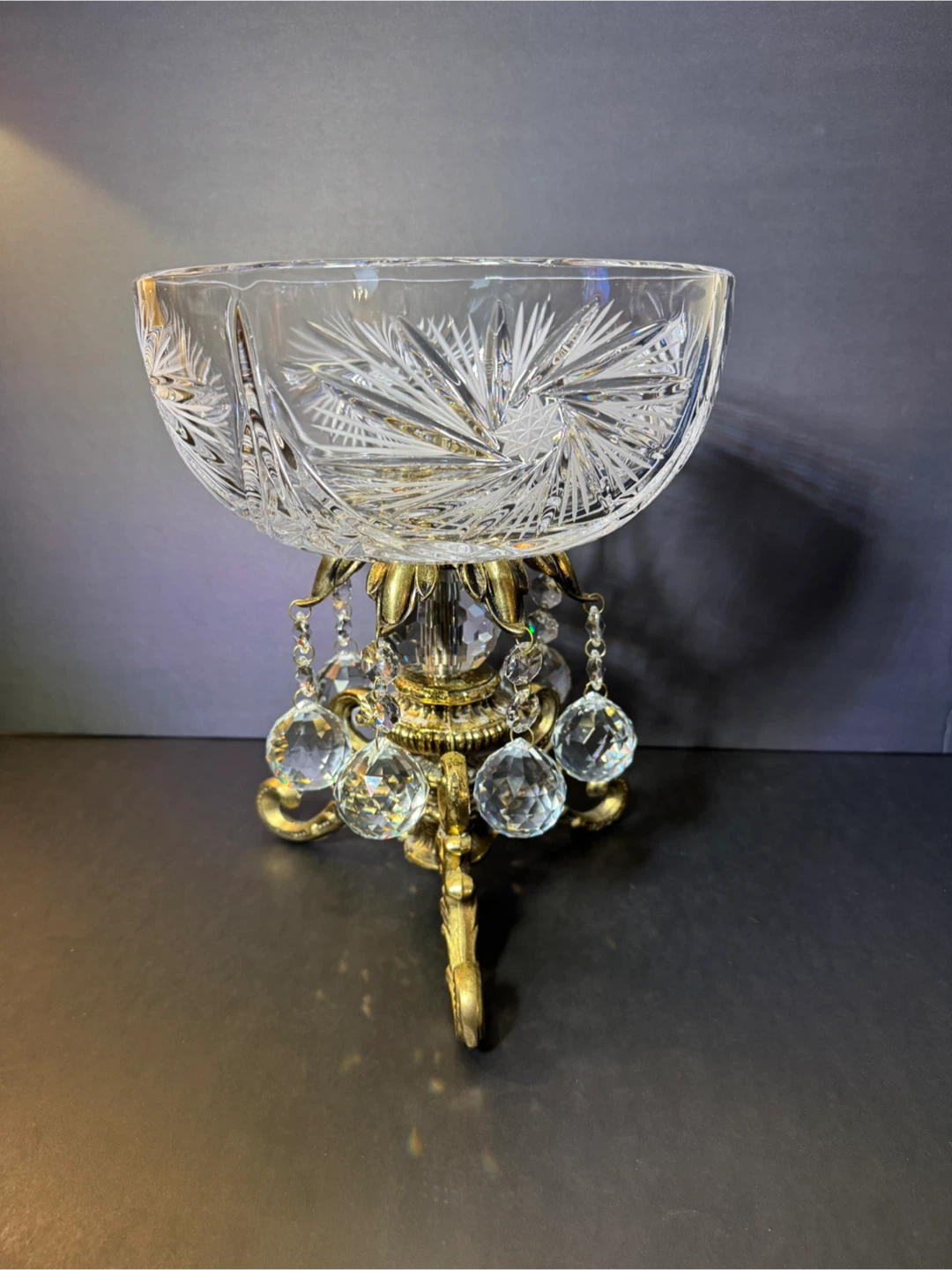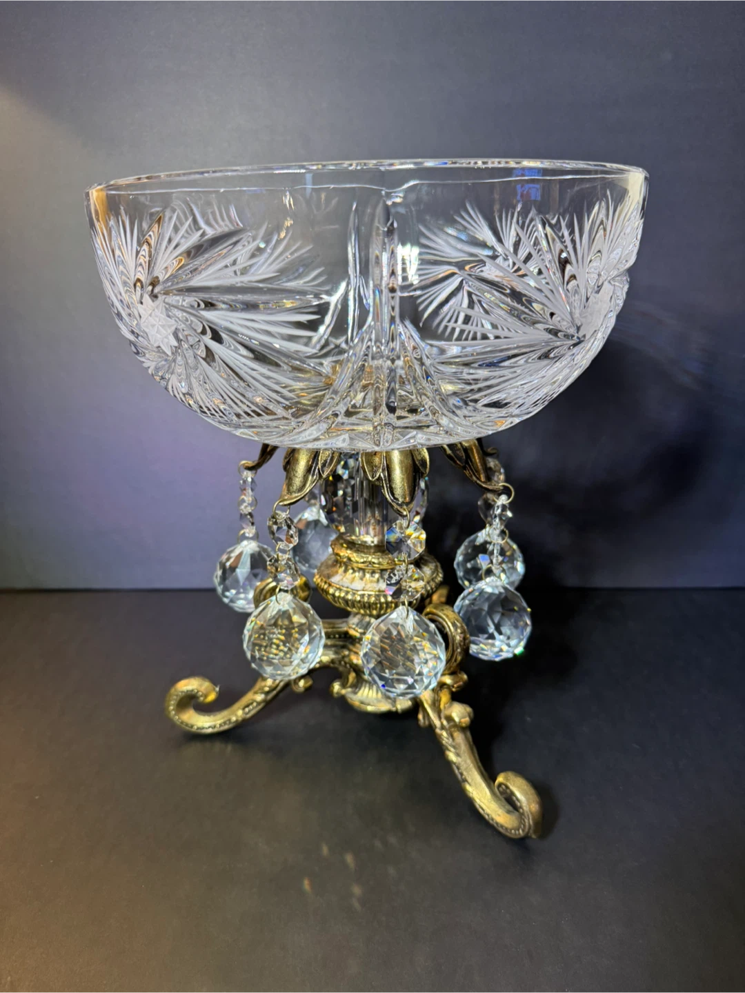 Beautiful crystal bowl with intricate fan and star patterns, set on a decorative brass stand. It's adorned with dangling clear crystal prisms. This piece adds a touch of elegance to any room. High 12 inches,wide 10 inches