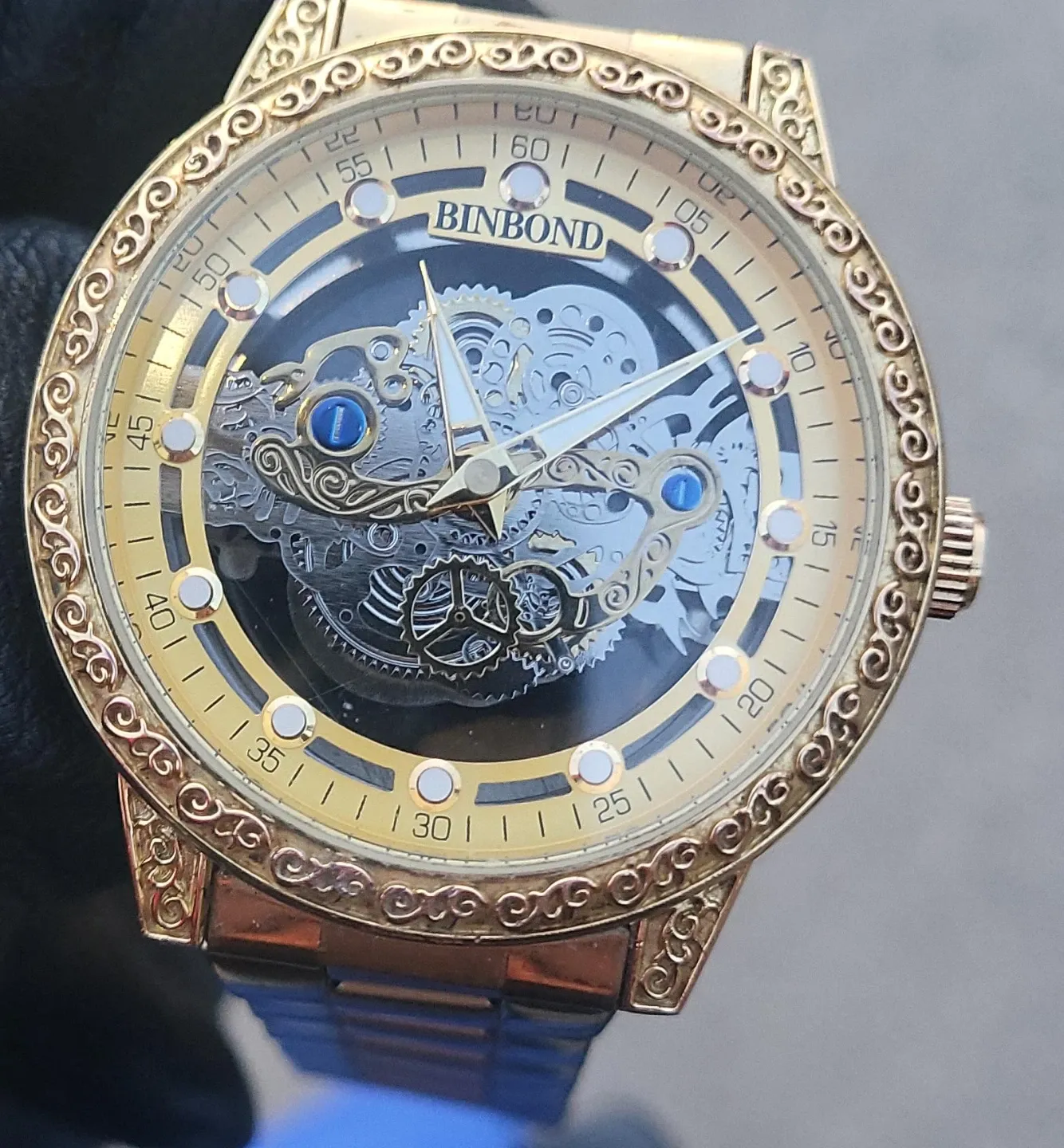 This BINBOND watch features an automatic skeleton movement. It has a gold-tone case and a metal band. The watch displays time with visible gears and intricate detailing.