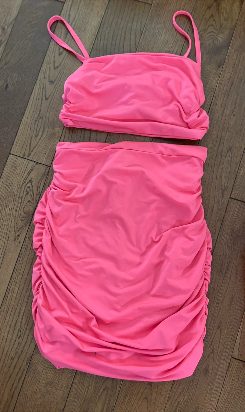 This set includes a ruched cami top and a matching ruched mini skirt. It's made of a stretchy, form-fitting material. The colour is a vibrant hot pink. This outfit's great for a night out! Size small