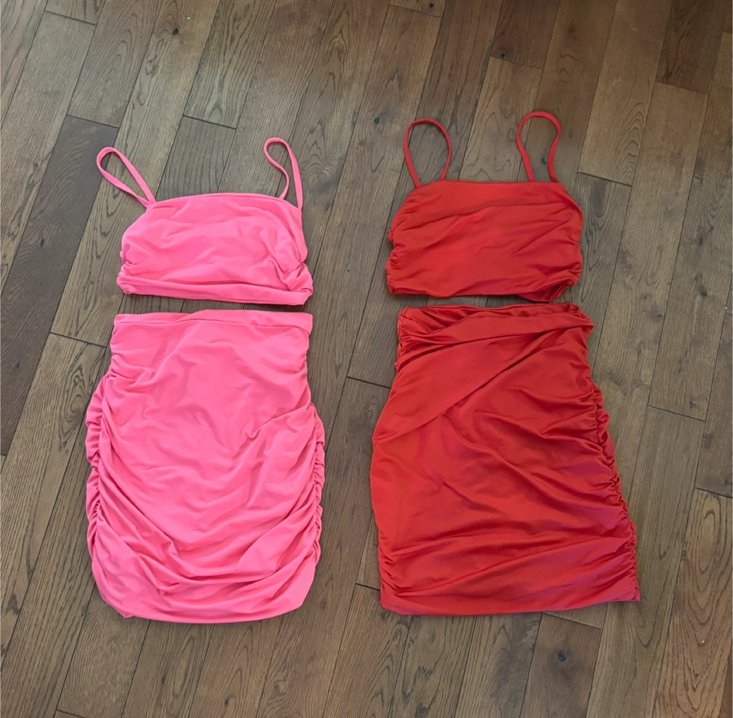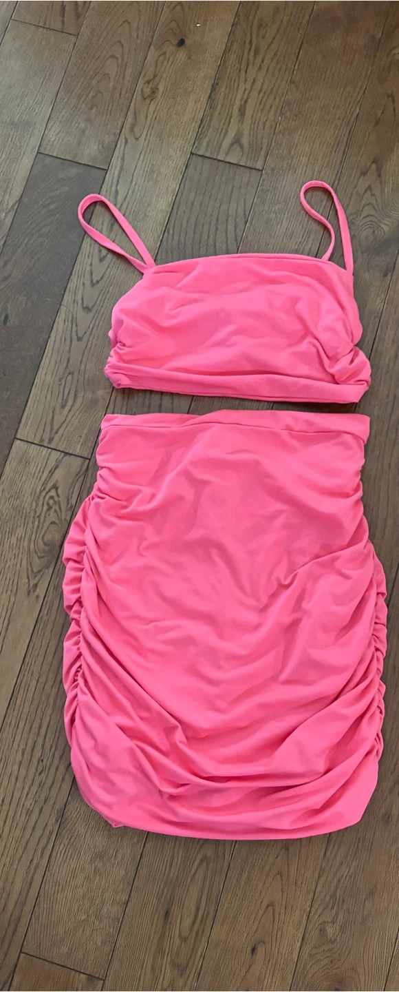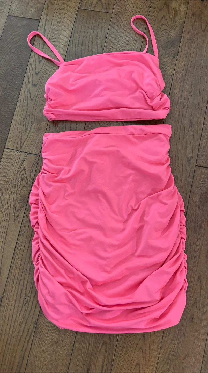 This set includes a ruched cami top and a matching ruched mini skirt. It's made of a stretchy, form-fitting material. The colour is a vibrant hot pink. This outfit's great for a night out! Size small