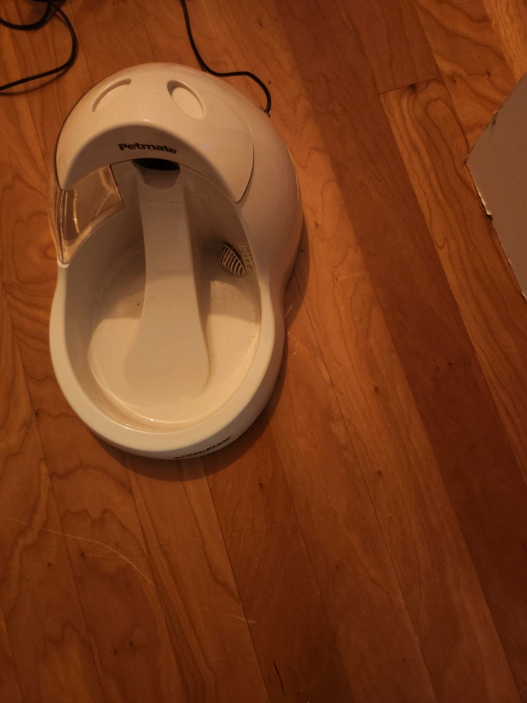 This is a Petmate white pet water fountain. It has a filter system to keep water fresh. It's great for keeping your pet hydrated!
