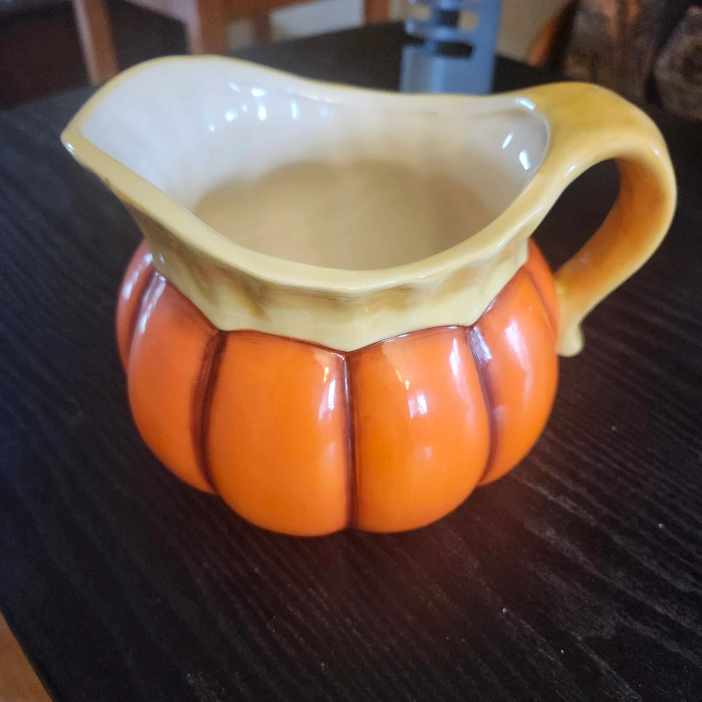 A cute pumpkin-shaped pitcher, perfect for adding a touch of autumn to your table setting! The pitcher is orange with a cream-coloured interior and handle.