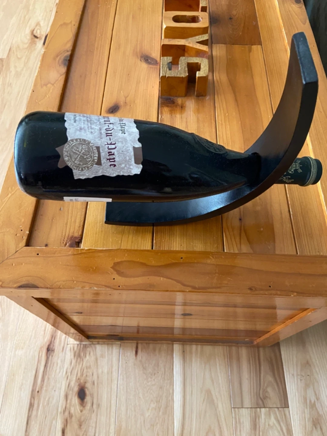 A sleek black wooden wine bottle holder with a decorative silver accent. It's designed to hold one bottle of wine. This stand is perfect for displaying your favourite bottle on a table or counter. Wine NOT included