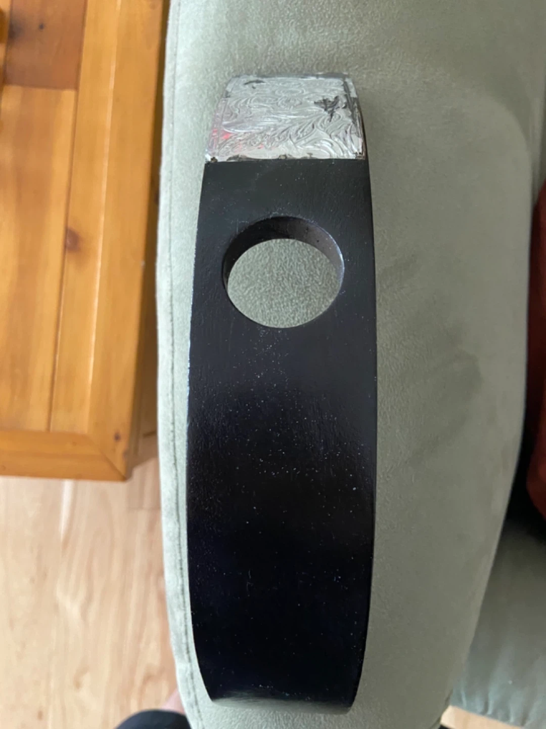 A sleek black wooden wine bottle holder with a decorative silver accent. It's designed to hold one bottle of wine. This stand is perfect for displaying your favourite bottle on a table or counter. Wine NOT included