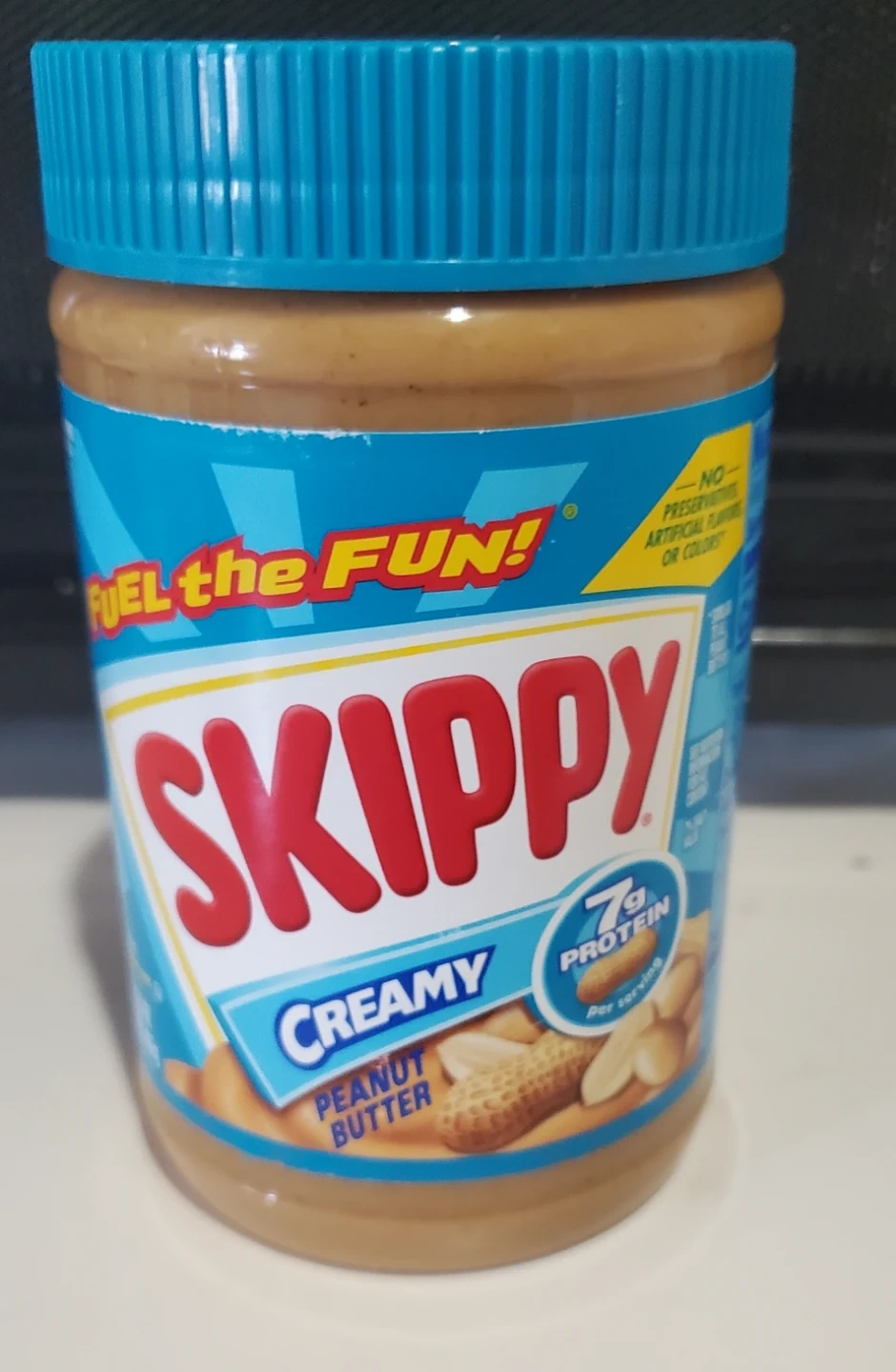 This is a jar of Skippy creamy peanut butter. It's made with no preservatives, artificial flavors, or colors. Each serving contains 7g of protein!