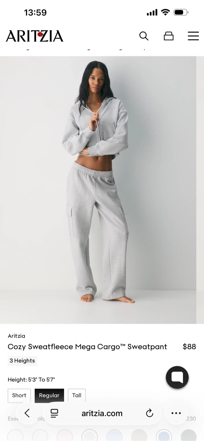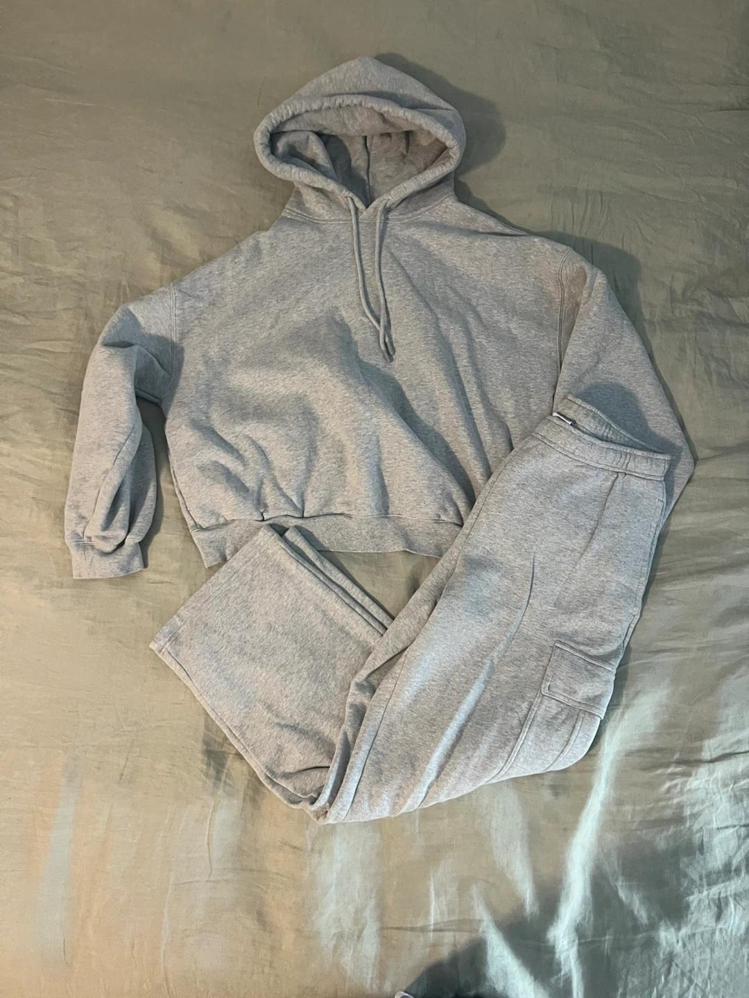 Sweater is Cozy Fleece Mega Drop Shoulder Hoodie and the pants are Cozy Sweatfleece Mega Cargo™ Sweatpant, both in the colour Heather chrome. Price is for both and is firm