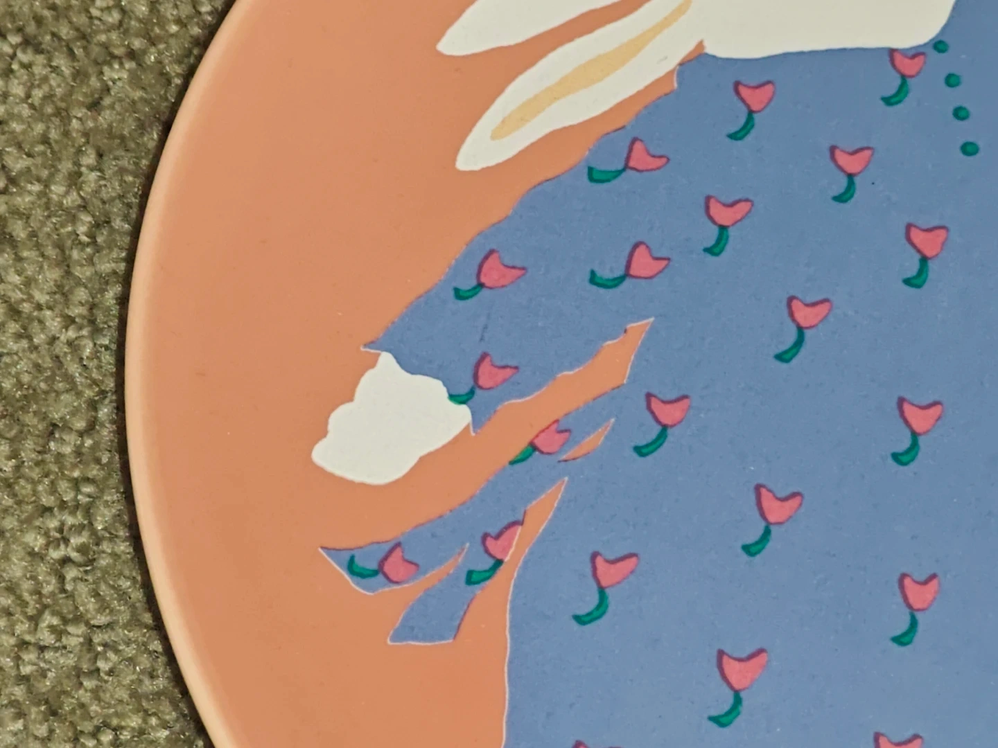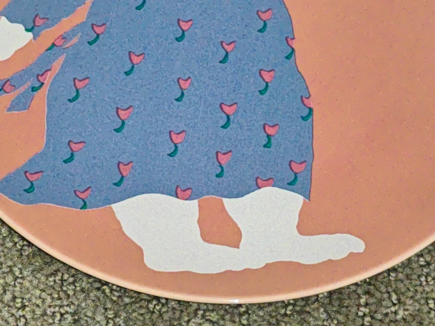 I am selling a Vintage 1988 Paris Bottman Design Plate Rabbit In Dress with Tulip Flower in great condition. This plate’s wonderful graphics features a rabbit smelling a tulip in a blue dress with tulips on a peachy pink glaze background. The bottom is marked Made in Japan. Bottman Designs, 1988. The plate has a glossy look on the plate.