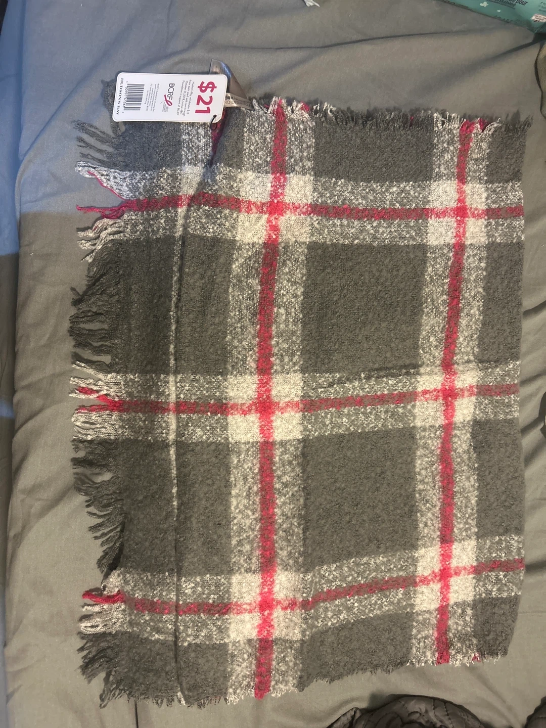 139Selling a BCRE scarf in excellent condition! It features a stylish gray plaid pattern with red and white accents. The scarf has a fringed edge and was originally bought for $21.